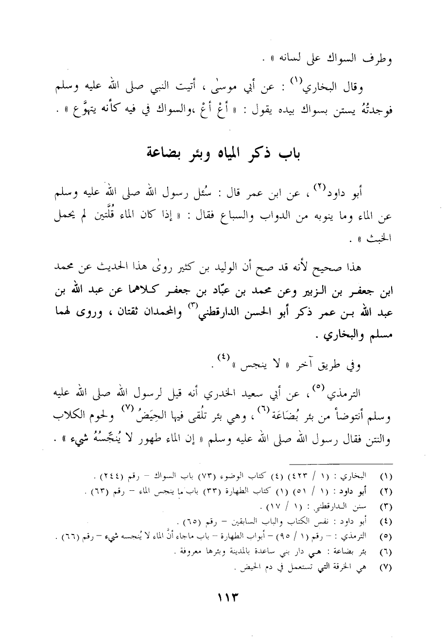 (¬5) الترمذي: - رقم (1/ 95) - أبواب الطهارة - باب ما جاء أنَّ الماء لا يُنحسه شيء - رقم (66).