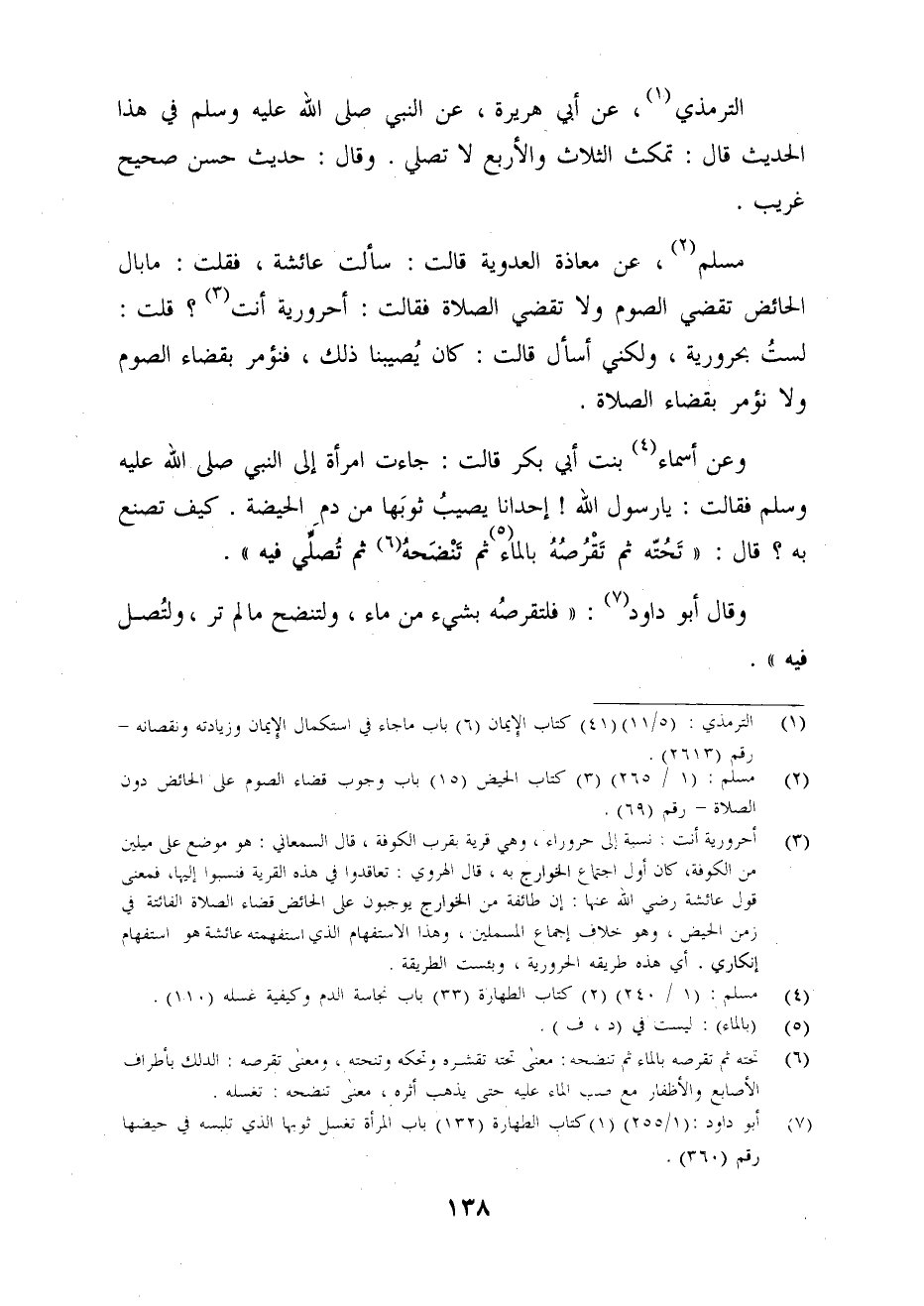 (¬3) أحرورية أنت: نسبة إلى حروراء، وهى قرية بقرب الكوفة، قال السمعاني: هو موضع على ميلين من الكوفة، كان أول اجتماع الخوارج به، قال الهروي: تعاقدوا في هذه القرية فنسبوا إليها، فمعنى قول عائشة - رضي الله عنها -: إن طائفة من الخوارج يوجبون على الحائض قضاء الصلاة! الفائتة في زمن الحيض، وهو خلاف إجماع المسلمين، وهذا الإستفهام الذي استفهمته عائشة هو استفهام إنكارى. أي هذه طريقه الحرورية، وبئست الطريقة.