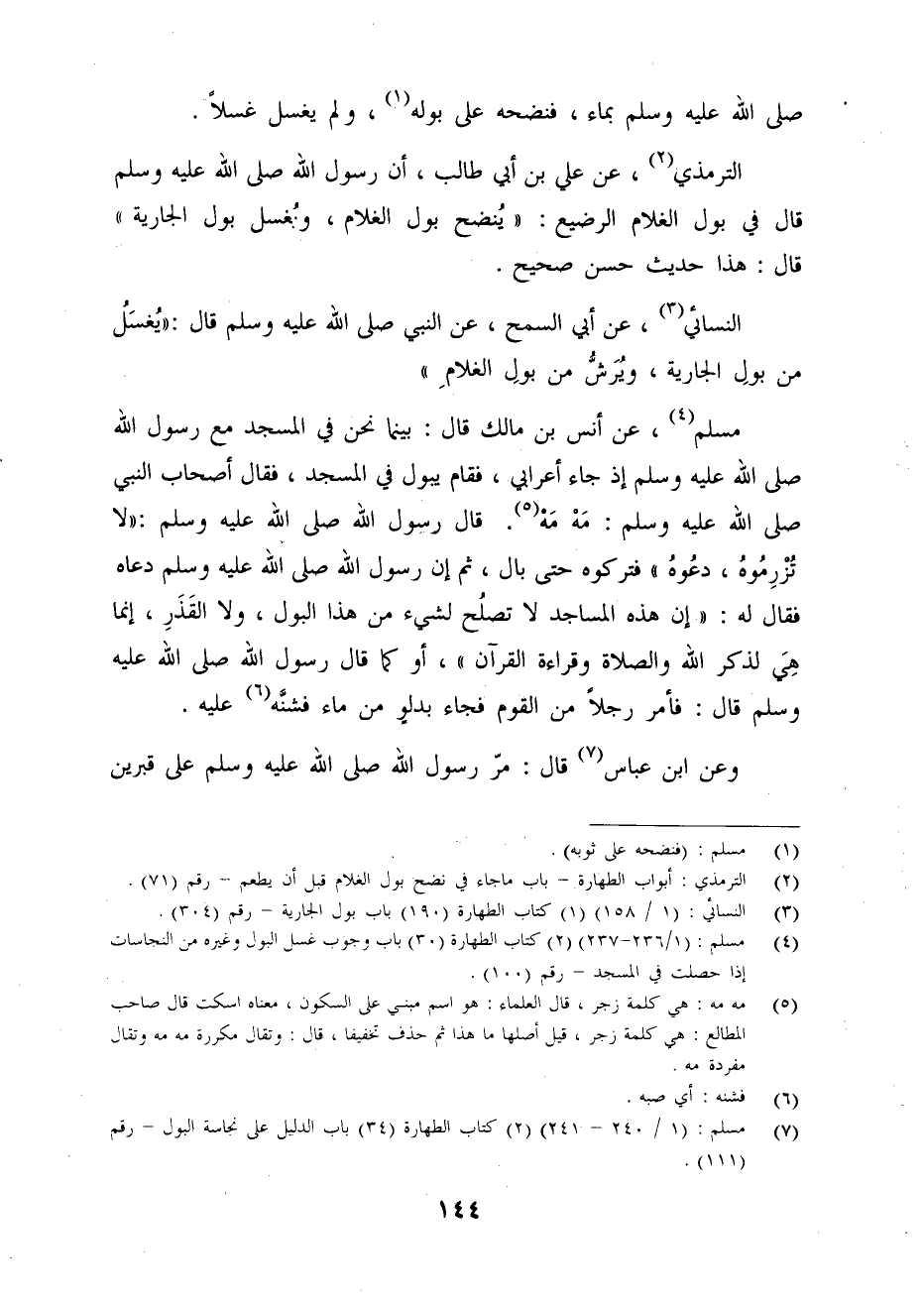(¬7) مسلم: (1/ 240 - 241) (2) كتاب الطهارة (34) باب الدليل على نجاسة البول - رقم (111).
