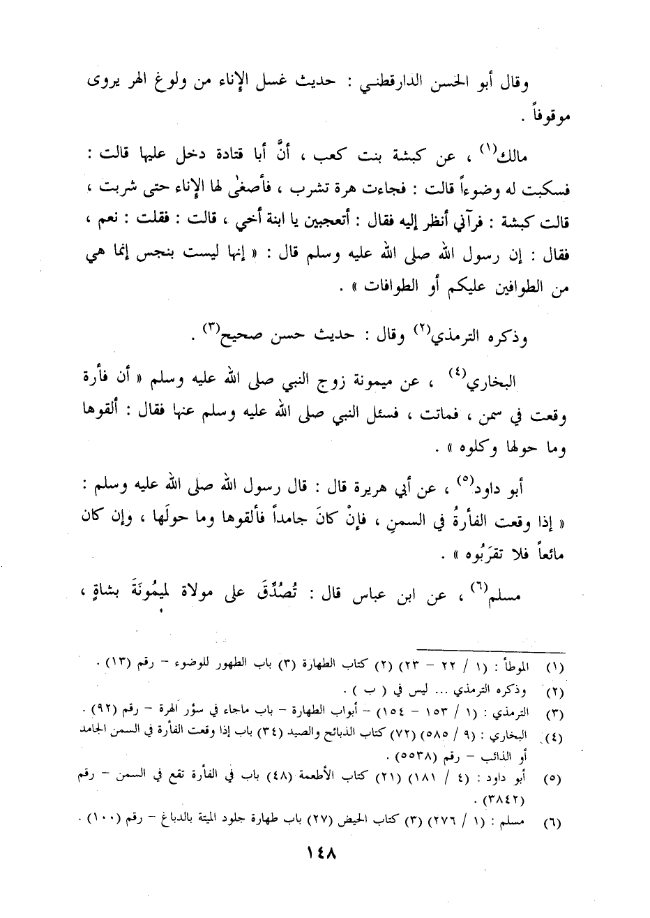(¬3) الترمذي: (1/ 153 - 154) - أبواب الطهارة - باب ما جاء في سؤر الهرة - رقم (12).