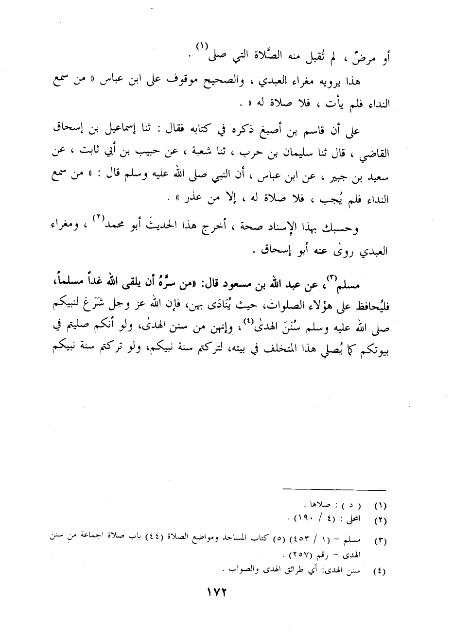 مسلم (¬3)، عن عبد الله بن مسعود قال: "من سرَّهُ أن يلقى الله غدًا مسلمًا، فليُحافظ على هؤلاء الصلوات، حيث يُنَادَى بهن، فإن الله -عَزَّ وَجَلَّ- شَرَعَ لنبيكم - صلى الله عليه وسلم - سُنَنَ الهدى (¬4)، وإنهن من سنن الهدى، ولو أنكم صليتم في بيوتكم كما يُصلي هذا المتخلف في بيته، لتركتم سنة نبيكم، ولو تركتم سنة نبيكم