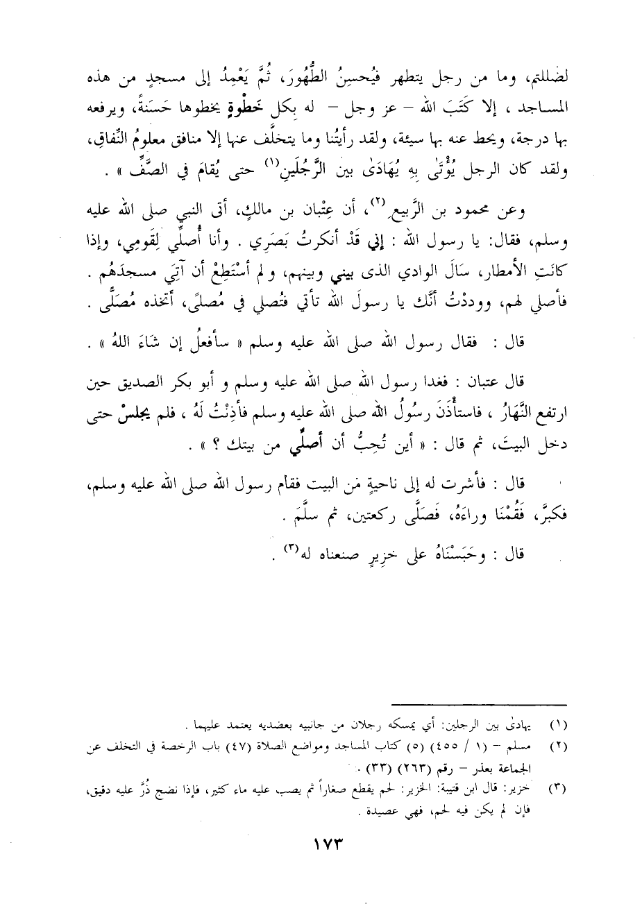 وعن محمود بن الرَّبيعِ (¬2)، أن عِتْبان بن مالكٍ، أتى النبي - صلى الله عليه وسلم -، فقال: يا رسول الله: إني قَدْ أنكرتُ بَصَرِي. وأنا أُصلِّي لِقَومِي، وإذا كانَتِ الأمطار، سَالَ الوادي الذي بيني وبينهم، ولم أسْتَطِعْ أن آتِيَ مسجدَهُم. فأصلي لهم، ووددْتُ أنَّك يا رسولَ الله تأتي فتُصلي في مُصلَّى، أتخذه مُصَلَّى.