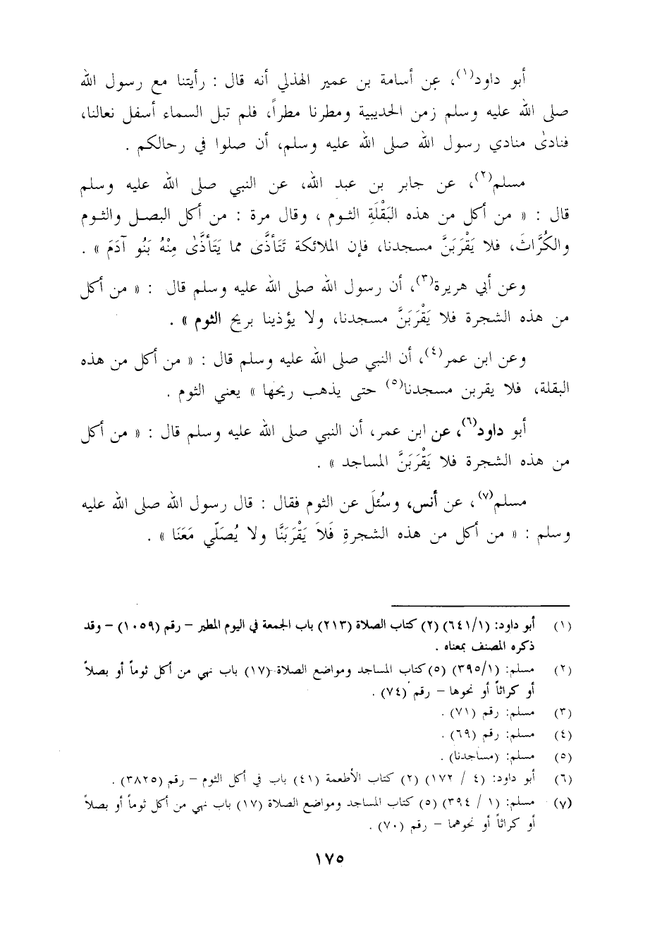 أبو داود (¬6)، عن أبن عمر، أن النبي - صلى الله عليه وسلم - قال: "من أكل من هذه الشجرة فلا يَقْرَبَنَّ المساجد".
