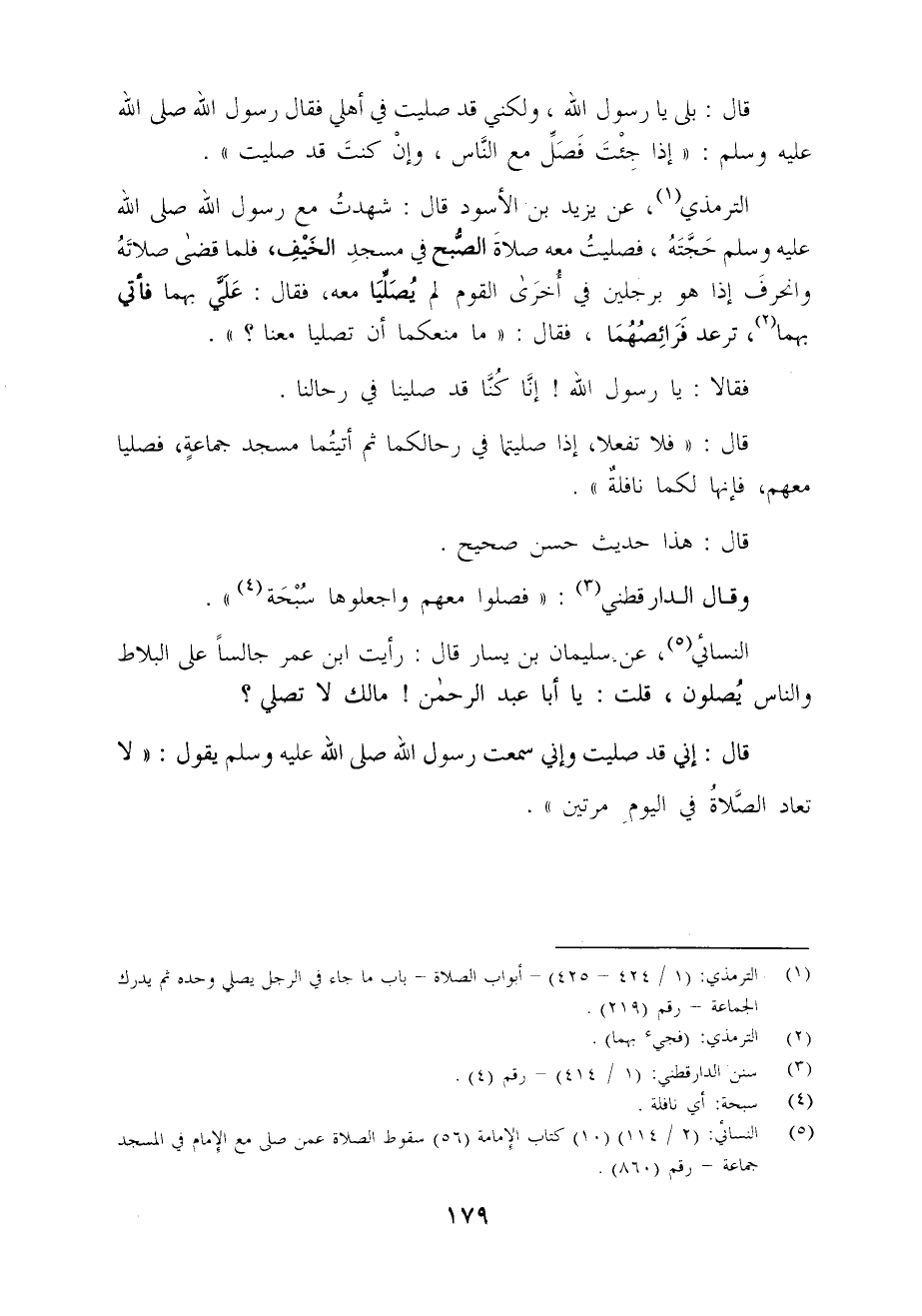 (¬1) الترمذي: (1/ 424 - 425) أبواب الصلاة - باب ما جاء في الرجل يصلى وحده ثم يدرك الجماعة - رقم (219).