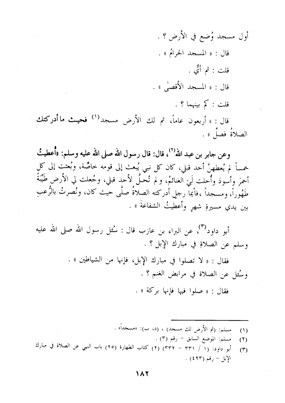 (¬3) أبو داود: (1/ 331 - 332) (2) كتاب الطهارة (25) باب النهى عن الصلاة في مبارك الإِبل - رقم (493).