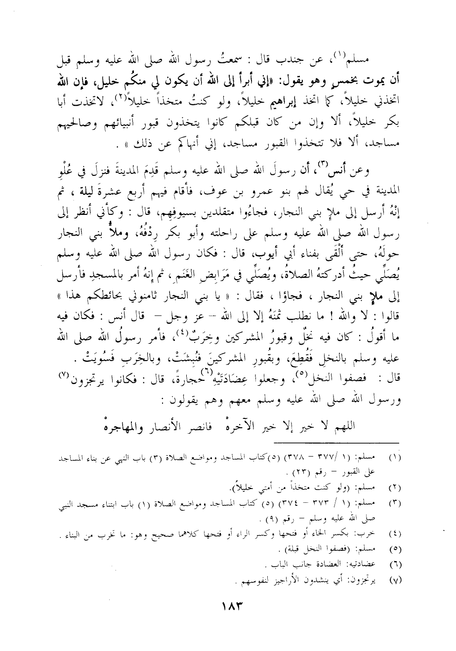 (¬1) مسلم: (1/ 377 - 378) (5) كتاب المساجد ومواضع الصلاة (3) باب عن بناء المساجد على القبور - رقم (23).