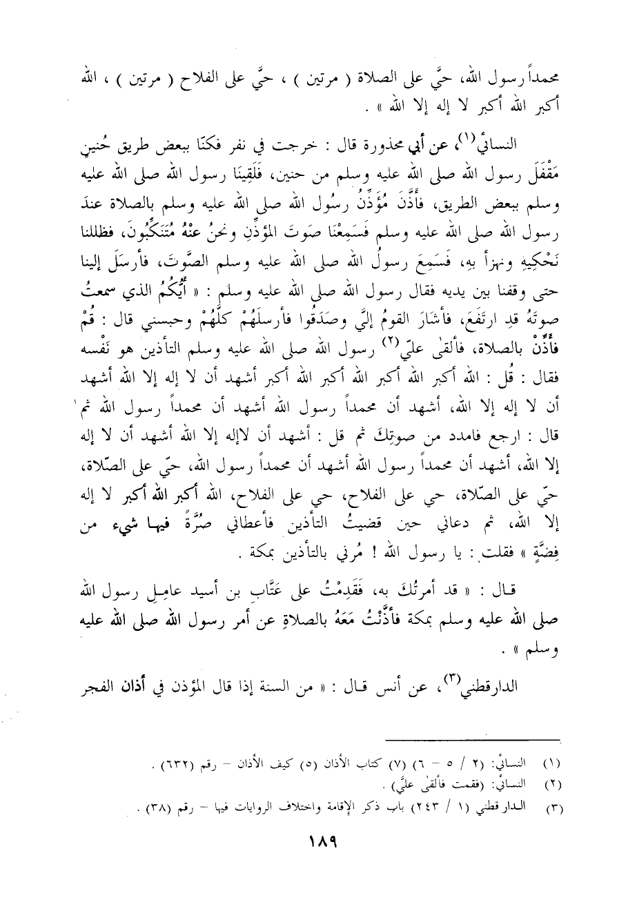 النسائي (¬1)، عن أبي محذورة قال: خرجت في نفر فكنَّا ببعض طريق حُنينِ مَقْفَلَ رسول الله - صلى الله عليه وسلم - من حنين، فَلَقِينَا رسول الله - صلى الله عليه وسلم - ببعض الطريق، فأَذَّنَ مُؤَذِّنُ رسُول الله - صلى الله عليه وسلم - بالصلاة عندَ رسول الله - صلى الله عليه وسلم - فَسَمِعْنَا صَوتَ المؤذِّنِ ونحنُ عنْهُ مُتَنَكِّبُونَ، فظللنا نَحْكِيهِ ونهزأ بهِ، فَسَمِعَ رسولُ الله - صلى الله عليه وسلم - الصَّوتَ، فأرسَلَ إلينا حتى وقفنا بنِ يديه فقال رسول الله - صلى الله عليه وسلم -: "أَيُّكُمُ الذي سمعتُ صوتَهُ قدِ ارتَفَعَ، فأشَارَ القومُ إليَّ وصَدَقُوا فأرسلَهُمْ كلَّهُمْ وحبسني قال: قُمْ فأَذِّنْ بالصلاة، فألقى عليّ (¬2) رسول الله - صلى الله عليه وسلم - التأذين هو نَفْسه فقال: قُل: الله أكبر الله أكبر الله أكبر الله أكبر أشهد أن لا إله إلا الله أشهد أن لا إله إلا الله، أشهد أن محمدًا رسول الله أشهد أن محمدًا رسول الله ثم قال: ارجع فامدد من صوتِكَ ثم قل: أشهد أن لا إله إلا الله أشهد أن لا إله إلا الله، أشهد أن محمدًا رسول الله أشهد أن محمدًا رسول الله، حيّ على الصَّلاة، حيّ على الصّلاة، حي على الفلاح، حي على الفلاح، الله أكبر الله أكبر لا إله إلا الله، ثم دعاني حين قضيتُ التأذين فأعطاني صُرَّةً فيها شئ من فِضَّةٍ" فقلت: يا رسول الله! مُرني بالتأذين بمكة.