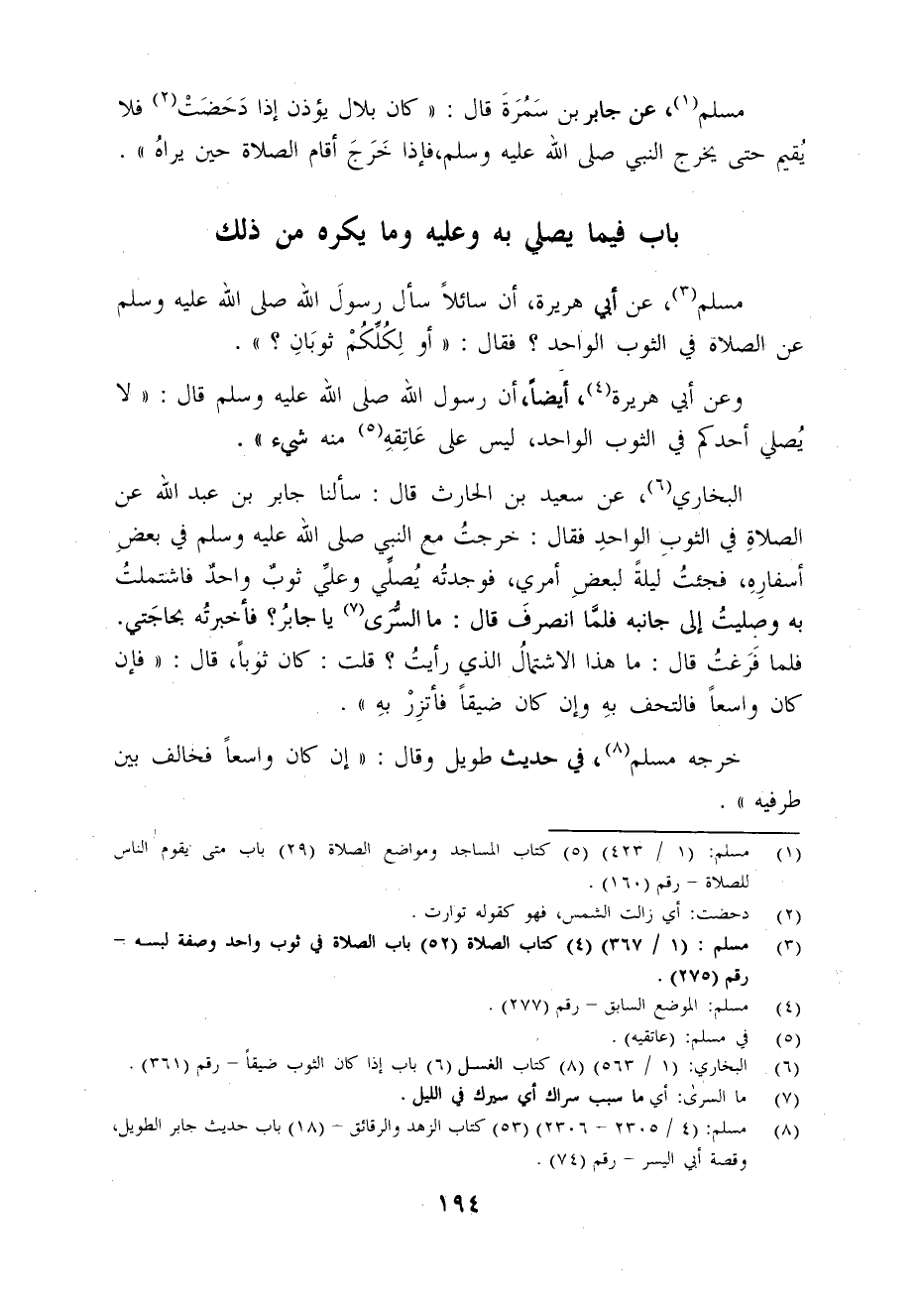 (¬3) مسلم: (1/ 367) (4) كتاب الصلاة (52) باب الصلاة في ثوب واحد وصفة لبسه - رقم (275).