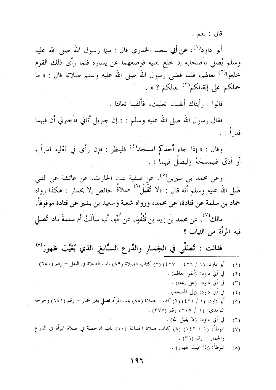 (¬1) أبو داود: (1/ 426 - 427) (2) كتاب الصلاة (89) باب الصلاة في النعلين - رقم (650).