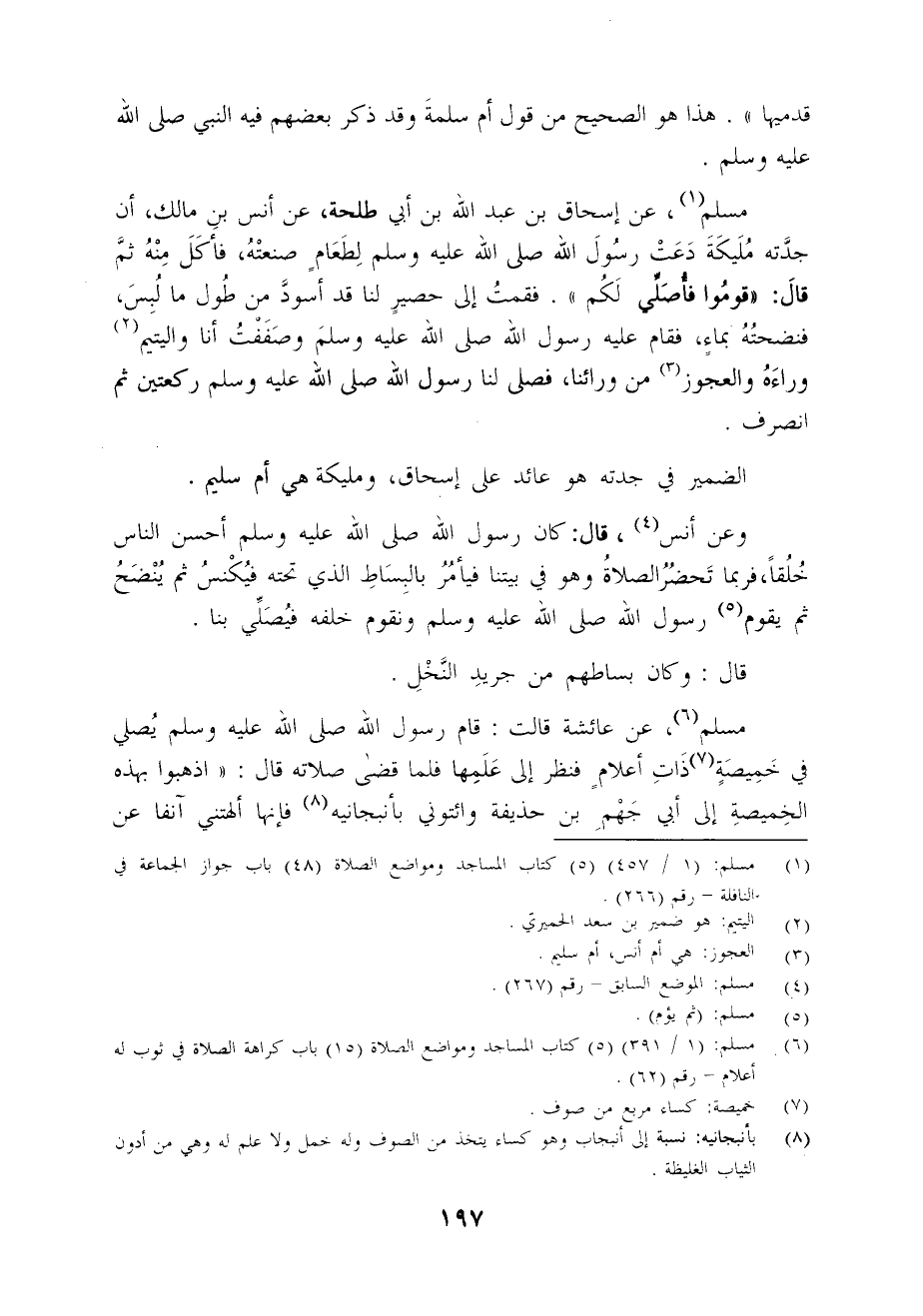 مسلم (¬1)، عن إسحاق بن عبد الله بن أبي طلحة، عن أنس بنِ مالك، أن جدَّته مُلَيكَةَ دَعَتْ رسُولَ الله - صلى الله عليه وسلم - لِطَعَامٍ صنعتْهُ، فأكَلَ مِنْهُ ثمَّ قالَ: "قومُوا فأُصَلِّى لَكُم". فقمتُ إلى حصيرٍ لنا قد أسودَّ من طُول ما لُبِسَ، فنضحتُهُ بماءٍ، فقام عليه رسول الله - صلى الله عليه وسلم - وصَفَفتُ أنا واليتيم (¬2) وراءَهُ والعجوز (¬3) من ورائنا، فصلى لنا رسول الله - صلى الله عليه وسلم - ركعتين ثم انصرف.
