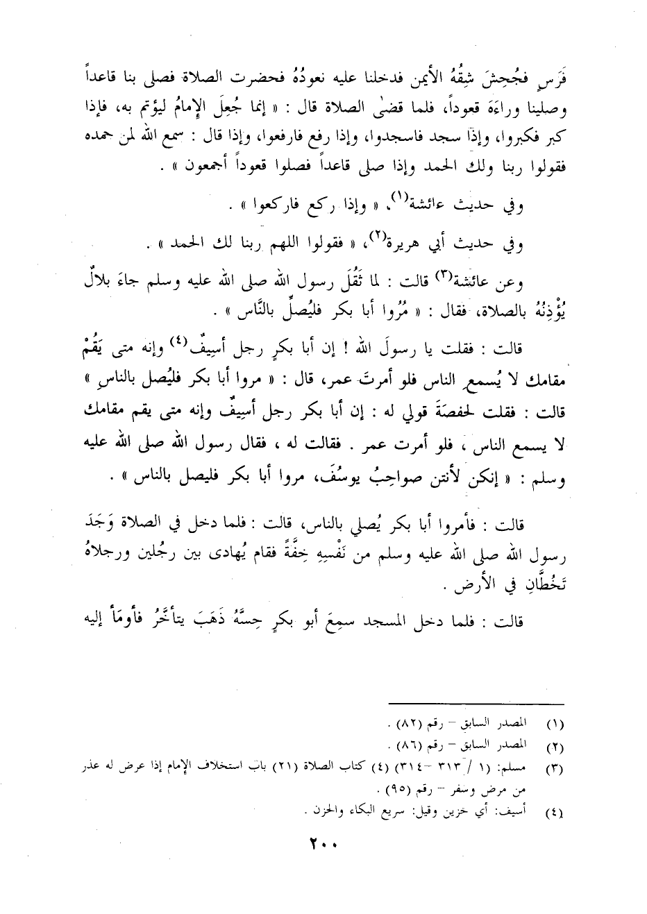 (¬3) مسلم: (1/ 313 - 314) (4) كتاب الصلاة (21) باب استخلاف الإمام إذا عرض له مرض وعذر - رقم (95).