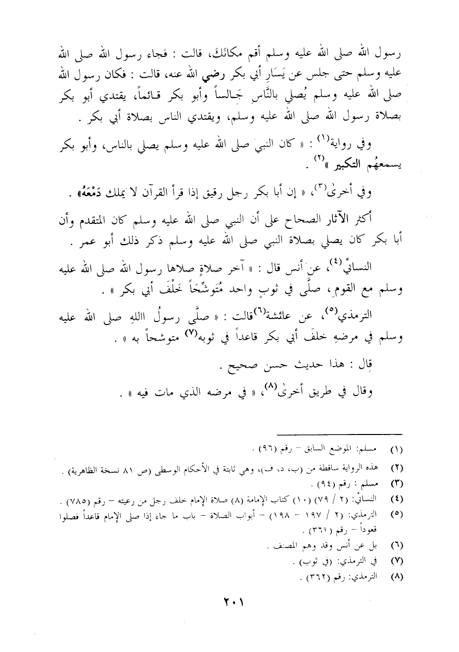 (¬5) الترمذي: (2/ 197 - 198) - أبواب الصلاة - باب ما جاء إذا صلى الإمام قاعداً فصلوا قعوداً - رقم (362).