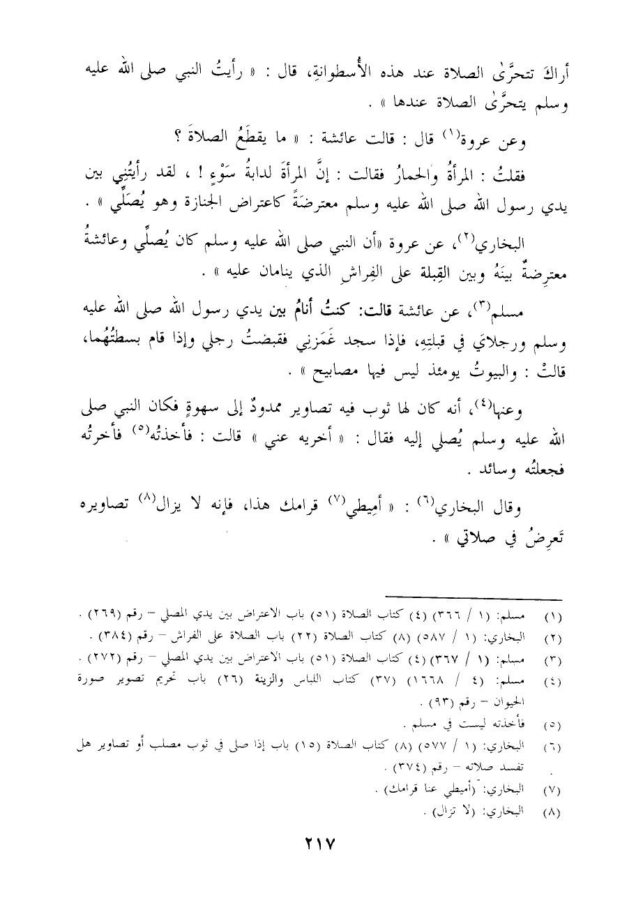 البخاري (¬2)، عن عروة "أن النبي - صلى الله عليه وسلم - كان يُصلي وعائشةُ معترِضةٌ بينَهُ وبين القِبلة على الفِراشِ الذي ينامان عليه".