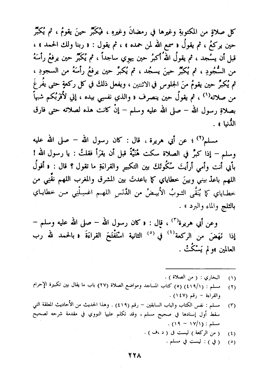 مسلم (¬2)؛ عن أبي هريرة، قال: كان رسول الله - صلى الله عليه وسلم - إذا كبر في الصلاة سكت هُنَيَّةَ قبل أن يقرَأ فقلتُ: يا رسول الله! بأبي أنت وأمي أرأيتَ سُكُوتَكَ بين التكبيرِ والقراءَةِ ما تقول؟ قال: "أقولُ اللهم باعدْ بيني وبينَ خطاياى كما باعدتَ بين المشرق والمغرب اللهم نقِّنِي من خطاياي كما يُنَقَّى الثوبُ الأبيضُ من الدَّنَس اللهم اغسِلْنِي من خطاياي بالثلج والماء والبرد".