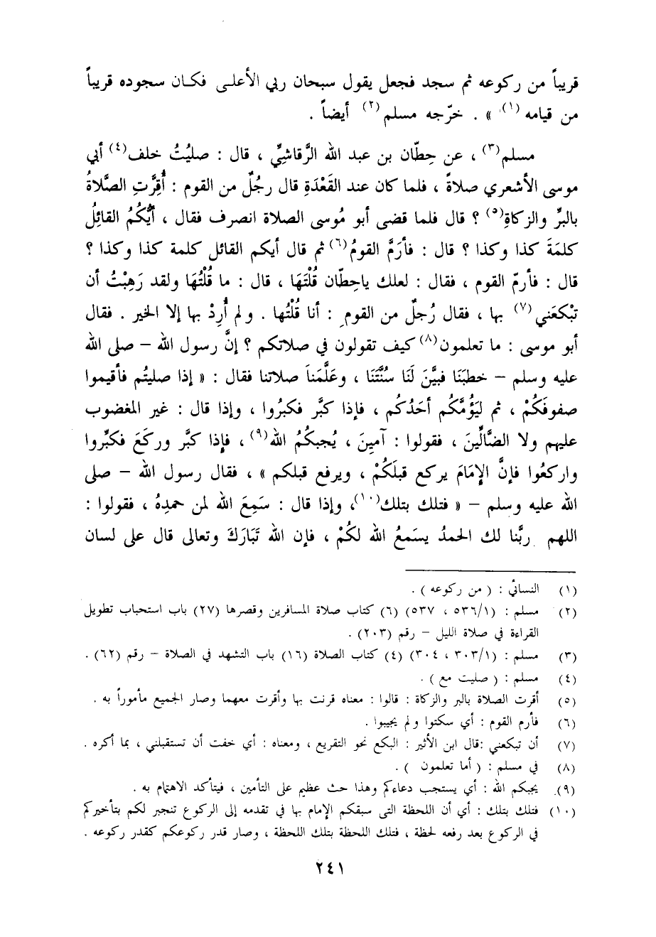 مسلم (¬3)، عن حِطّان بن عبد الله الرقاشِيِّ، قال: صليُتُ خلف (¬4) أبي موسى الأشعري صلاةً، فلما كان عند القَعْدَةِ قال رجُلٌ من القوم: أُقرَّتِ الصَّلاةُ بالبرِّ والزكاةِ (¬5)؟ قال فلما قضى أبو مُوسى الصلاة انصرف فقال، أيُّكُمُ القائِلُ كلمَةَ كذا وكذا؟ قال: فأرَمَّ القومُ (¬6) ثم قال أيكم القائل كلمة كذا وكذا؟ قال: فأرمّ القوم، فقال: لعلك يا حِطّان قُلْتَهَا، قال: ما قُلْتُهَا ولقد رَهِبْتُ أن تبْكعَنى (¬7) بها، فقال رُجلٌ من القومِ: أنا قُلْتُها. ولم أُردْ بها إلا الخير. فقال أبو موسى: ما تعلمون (¬8) كيف تقولون في صلاتكم؟ إنَّ رسول الله - صلى الله عليه وسلم - خطبَنَا فبيَّنَ لَنَا سُنَّتَنَا، وعَلَّمَناَ صلاتنا فقال: "إذا صليتُم فأقيموا صفوفَكُمْ، ثم ليَؤُمَّكُم أحَدُكُم، فإذا كبَّر فكبرُوا، وإذا قال: غير المغضوب عليهم ولا الضالِّينَ، فقولوا: آميِنَ، يُجبكُمُ الله (¬9)، فإذا كبَّر وركَعَ فكبِّروا واركعُوا فإن الامَامَ يركع قبلَكُمْ، ويرفع قبلكم"، فقال رسول الله - صلى الله عليه وسلم - " فتلك بتلك (¬10)، وإذا قال: سَمِعَ الله لمن حمدِهُ، فقولوا: اللهم ربنا لك الحمدُ يسَمعُ الله لكُمْ، فإن الله تَبَارَكَ وتعالى قال على لسان