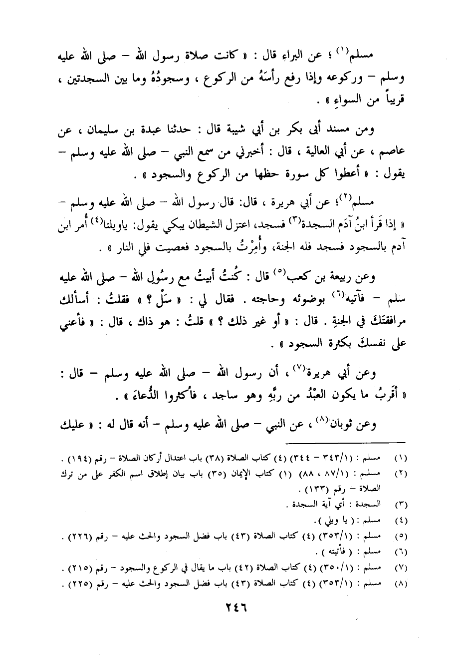 (¬8) مسلم: (1/ 353) (4) كتاب الصلاة (43) باب فضل السجود والحث عليه - رقم (225).
