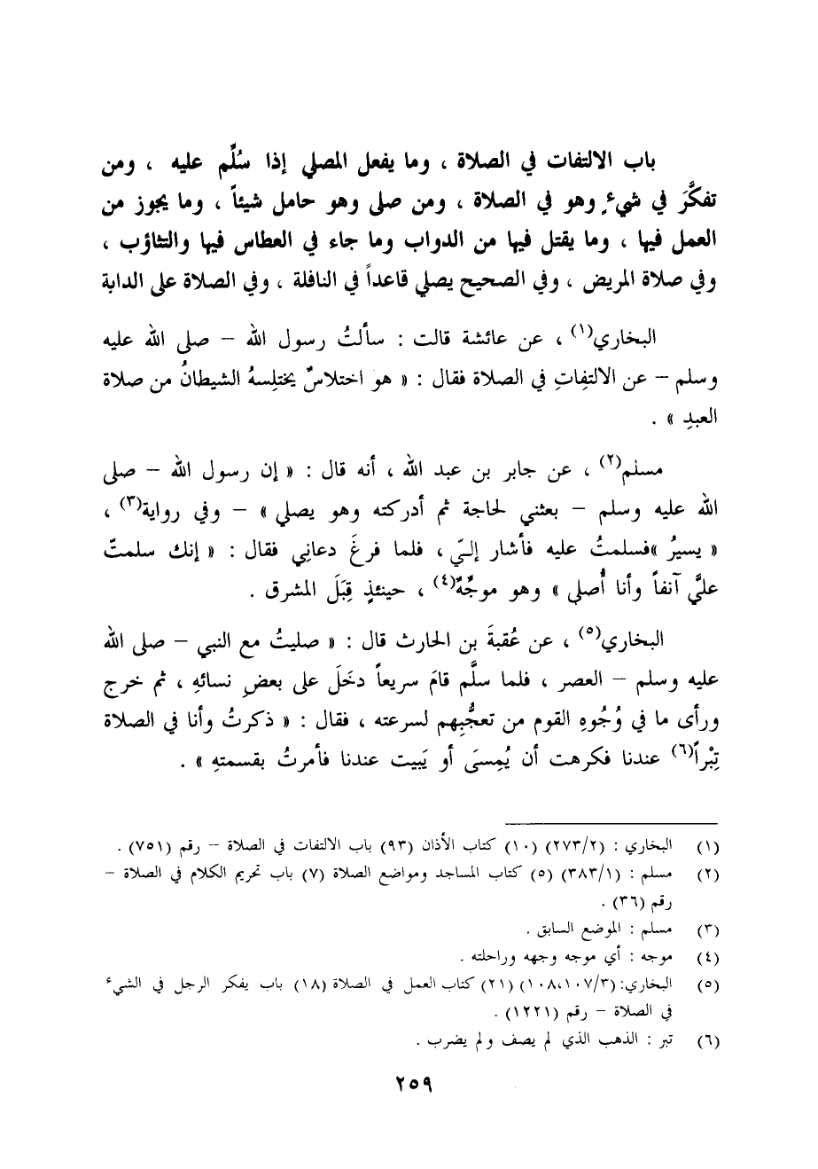 باب الإلتفات في الصلاة، وما يفعل المصلي إذا سُلِّم عليه، ومن تفكَّرَ في شيء وهو في الصلاة، ومن صلى وهو حامل شيئًا، وما يجوز من العمل فيها، وما يقتل فيها من الدواب وما جاء في العطاس فيها والتثاؤب، وفي صلاة الريض، وفي الصحيح يصلي قاعدًا في النافلة، وفي الصلاة على الدابة