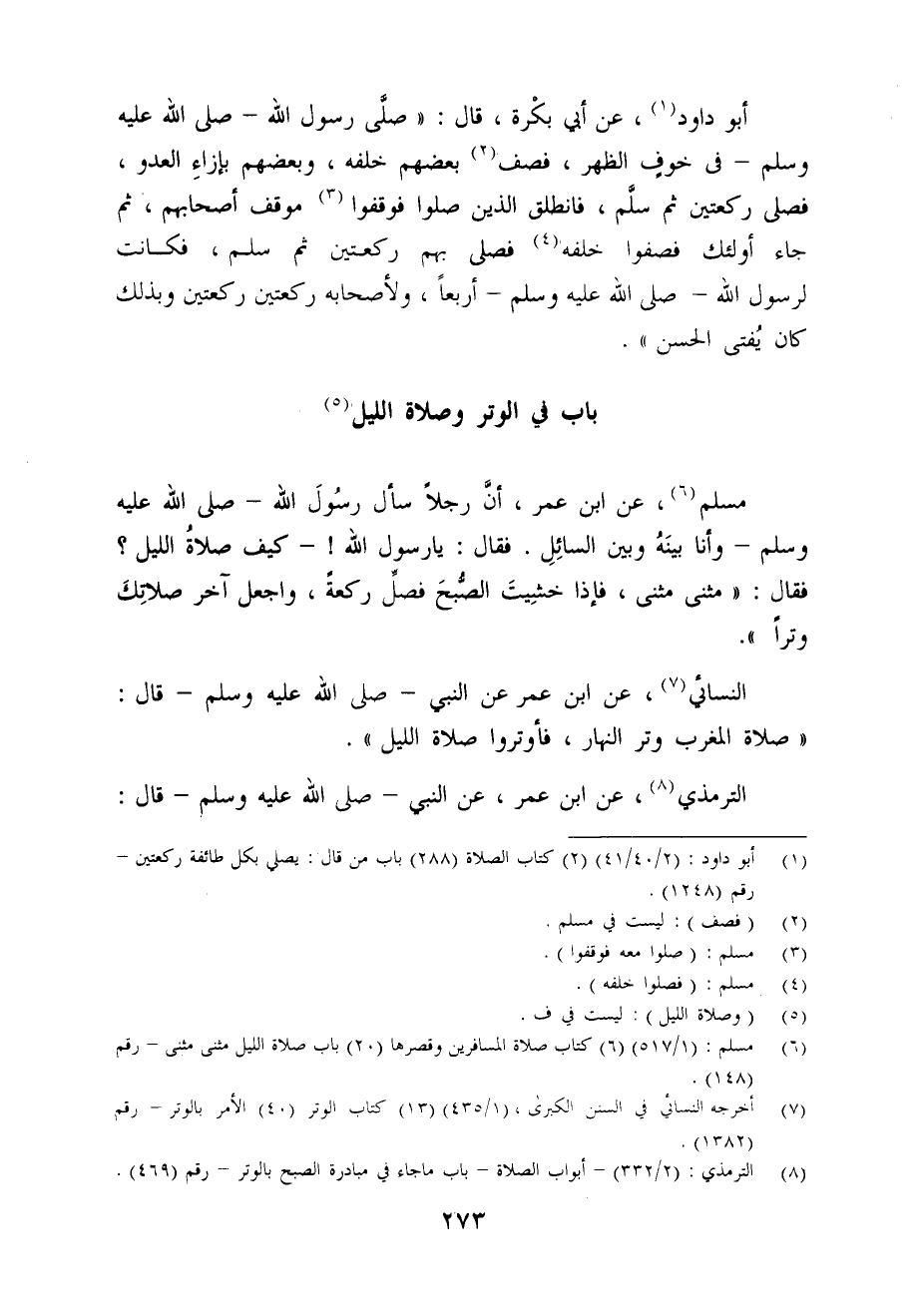 مسلم (¬6)، عن ابن عمر، أنَّ رجلًا سأل رسُولَ الله - صلى الله عليه وسلم - وأنا بينَهُ وبين السائِلِ. فقال: يا رسول الله! - كيف صلاةُ الليل؟ فقال: "مثنى مثنى، فإذا خشِيتَ الصُّبحَ فصلِّ ركعة، واجعل آخر صلاتِكَ وترًا".