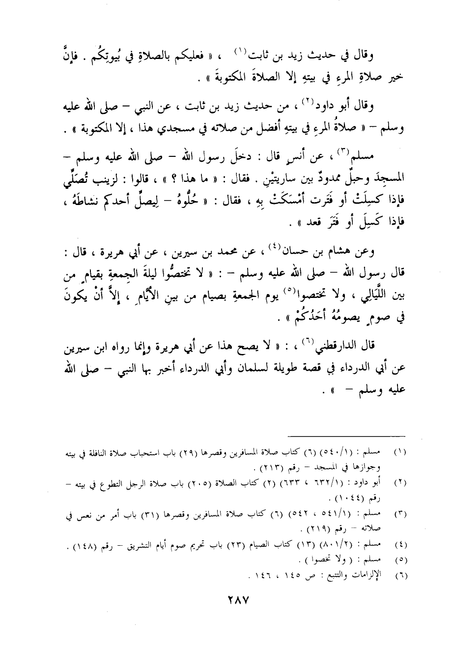 وعن هشام بن حسان (¬4)، عن محمد بن سيرين، عن أبي هريرة، قال: قال رسول الله - صلى الله عليه وسلم -: "لا تختصُّوا ليلةَ الجمعةِ بقيامٍ من بين اللَّيَالِي، ولا تختصوا (¬5) يوم الجمعةِ بصيام من بينِ الأيَّامِ، إلَّا أنْ يكونَ في صومٍ يصومُهُ أحَدُكُمْ".