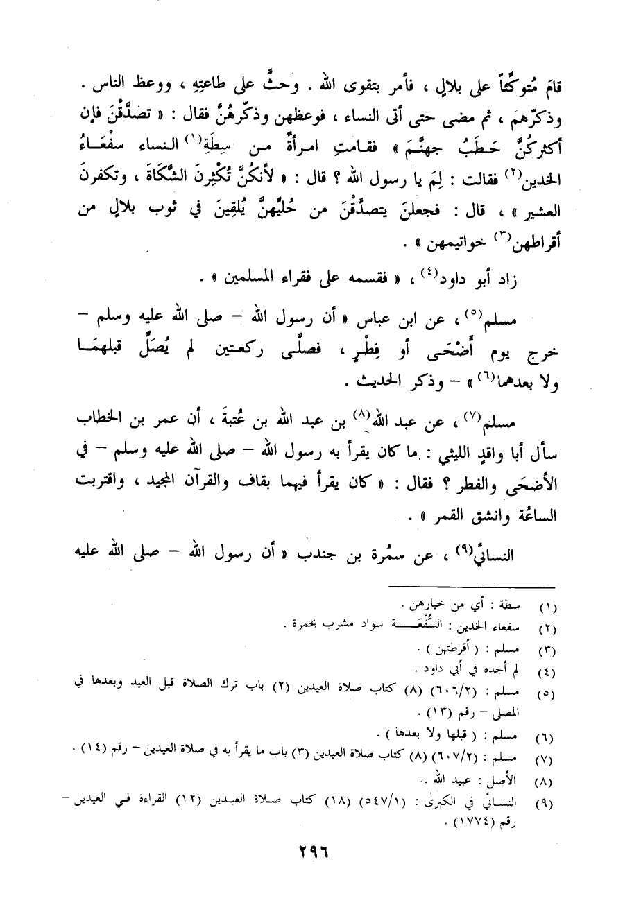 قامَ مُتوكِّئًا على بلالٍ، فأمر بتقوى الله. وحث على طاعتِهِ، ووعظ الناس. وذكرّهمَ، ثم مضى حتى أتى النساء، فوعظهن وذكّرهُنَّ فقال: "تصدَّقْنَ فإن أكثركُنَّ حَطَبُ جهنَّمَ" فقامتِ امرأةٌ من سِطَةِ (¬1) النساء سفْعَاءُ الخدين (¬2) فقالت: لِمَ يا رسول الله؟ قال: "لأنكُنَّ تُكْثِرنَ الشَّكَاةَ، وتكفرنَ العشير"، قال: فجعلنَ يتصدَّقْنَ من حُليِّهنَّ يُلقِينَ في ثوب بلالٍ من أقراطهن (¬3) خواتيمهن".