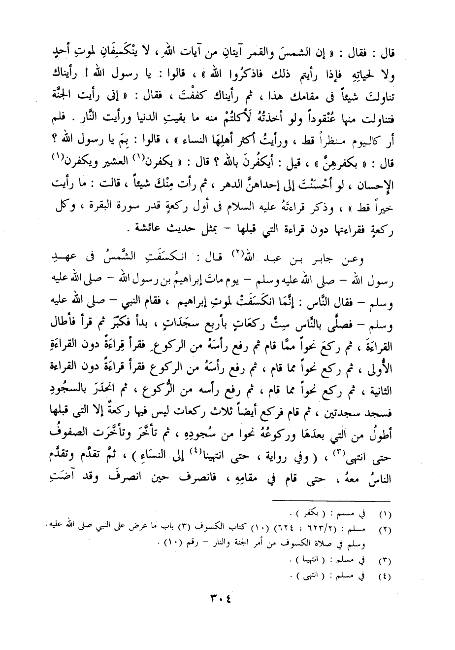 قال: فقال: "إن الشمس والقمر آيتانِ من آيات الله، لا ينْكَسِفَانِ لموتِ أحدٍ ولا لحياتِهِ فإذا رأيتم ذلك فاذكرُوا الله"، قالوا: يا رسول الله! رأيناك تناولتَ شيئًا في مقامك هذا، ثم رأيناك كففْتَ، فقال: "إني رأيت الجنَّة فتناولت منها عُنْقودًا ولو أخذتُهُ لَأكَلتُمْ منه ما بقيتِ الدنيا ورأيت النَّار. فلم أر كاليوم منظرًا قط، ورأيتُ أكثر أهلِهَا النساء"، قالوا: بِمَ يا رسول الله؟ قال: "بكفرهِنَّ"، قيل: أيكفُرنَ بالله؟ قال: "يكفرن (¬1) العشير ويكفرن (1) الإحسان، لو أحْسَنْتَ إلى إحداهنَّ الدهر، ثم رأت مِنْكَ شيئًا، قالت: ما رأيت خيرًا قط"، وذكر قراءتَهُ عليه السلام في أول ركعةٍ قدر سورة البقرة، وكل ركعةٍ فقراءتها دون قراءة التي قبلها- بمثل حديث عائشة.