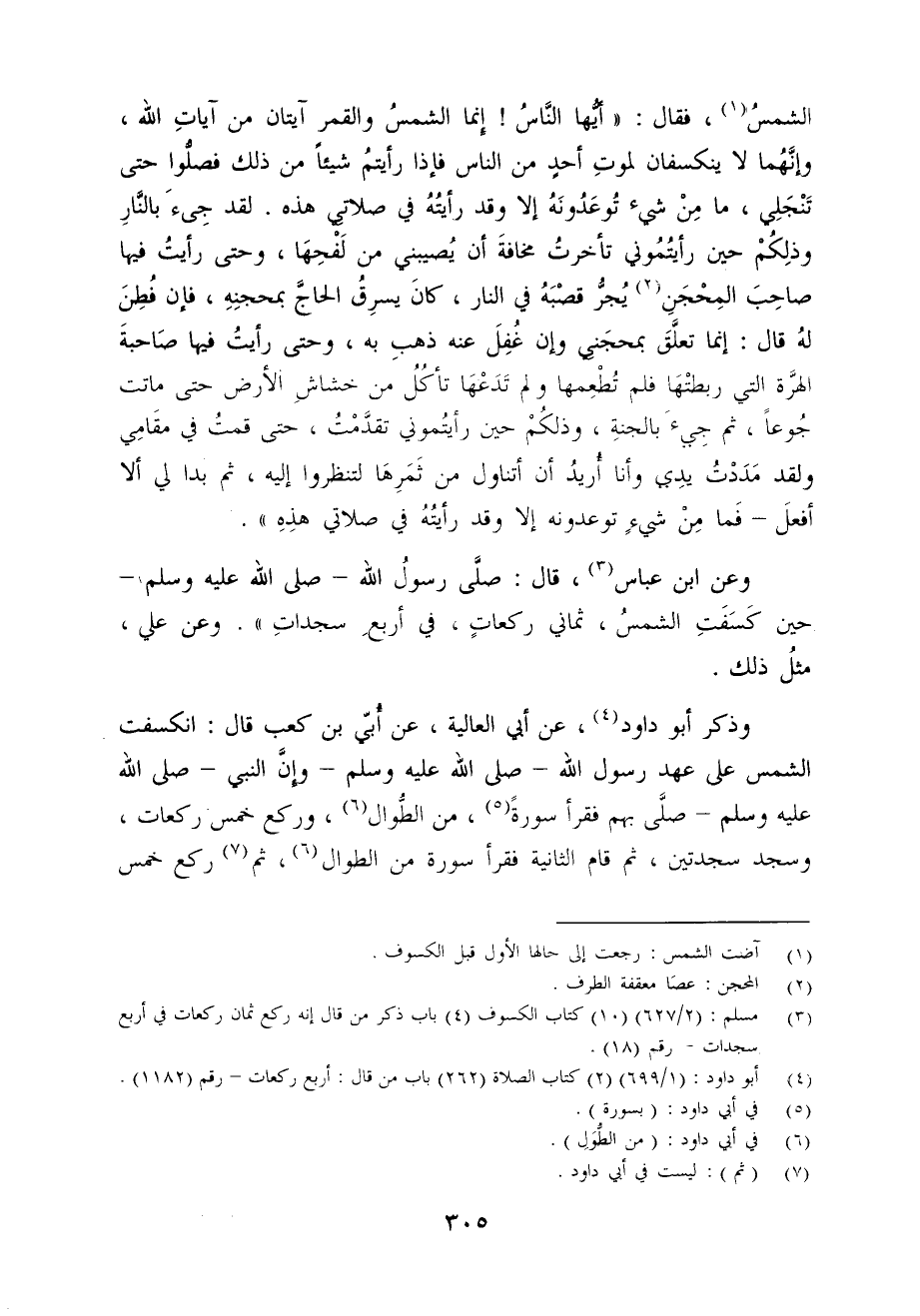 وذكر أبو داود (¬4)، عن أبي العالية، عن أُبيّ بن كعب قال: انكسفت الشمس على عهد رسول الله - صلى الله عليه وسلم - وإنَّ النبي - صلى الله عليه وسلم - صلَّى بهم فقرأ سورةً (¬5)، من الطُّوال (¬6)، وركع خمس- ركعات، وسجد سجدتين، ثم قام الثانية فقرأ سورة من الطوال 6)، ثم (¬7) ركع خمس