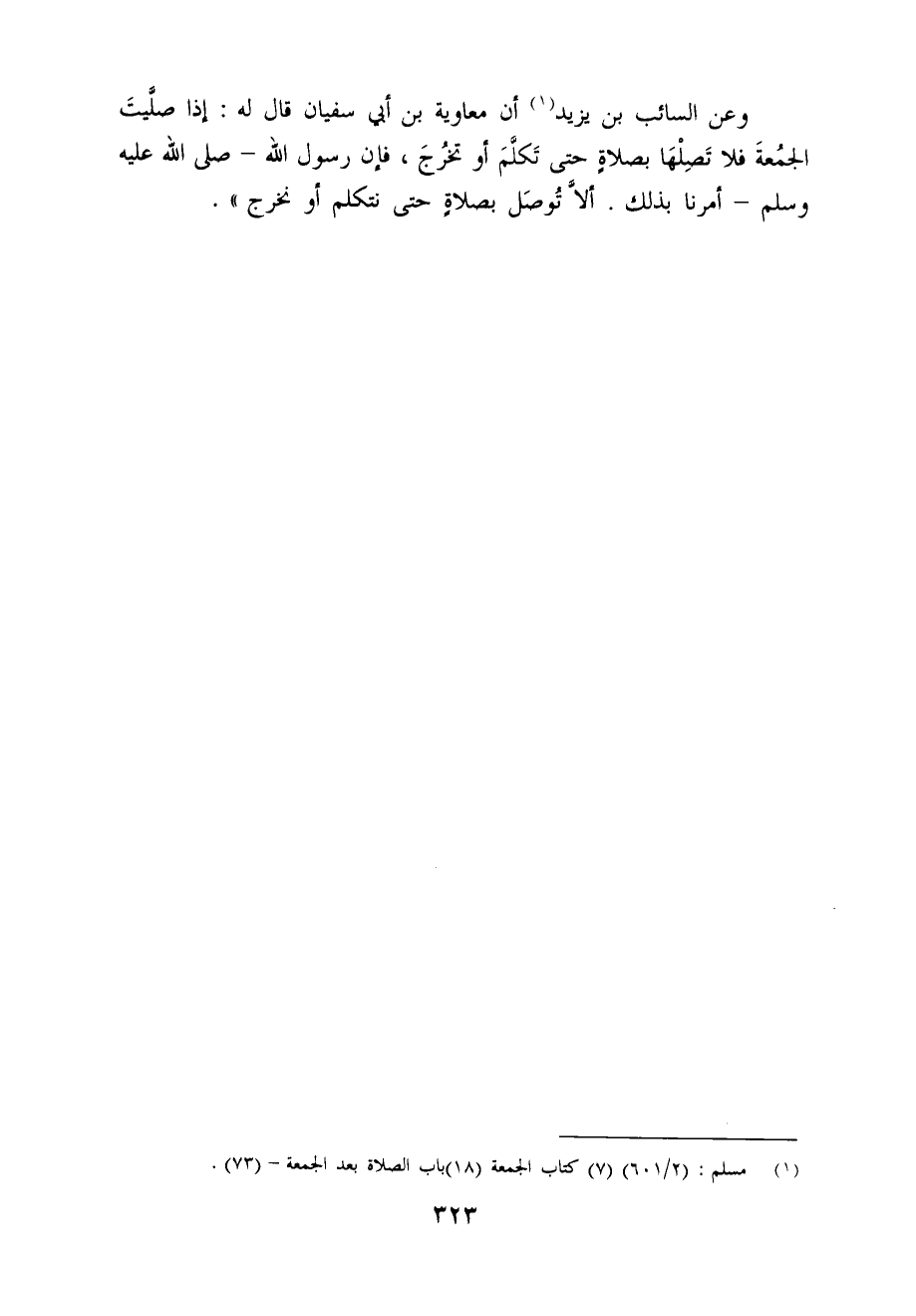 وعن السائب بن يزيد (¬1) أن معاوية بن أي سفيان قال له: إذا صلَّيتَ الجمُعةَ فلا تَصِلْهَا بصلاةٍ حتى تَكلَّمَ أو تخرُجَ، فإن رسول الله - صلى الله عليه وسلم - أمرنا بذلك. ألَّا تُوصَل بصلاة حتى نتكلم أو نخرج".