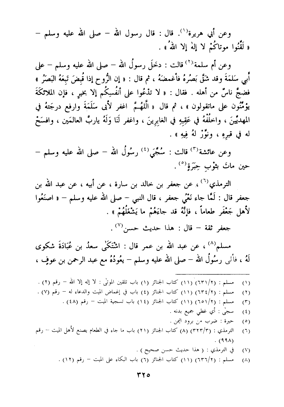 (¬6) الترمذي: (3/ 323) (8) كتاب الجنائز (21) باب ما جاء في الطعام يصنع لأهل الميت - رقم (998).