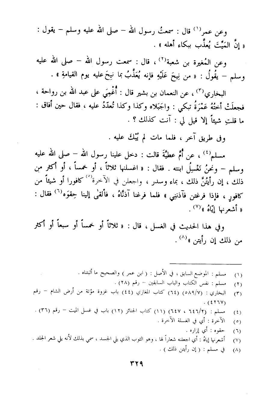 مسلم (¬4)، عن أُمَّ عطيَّةَ قالت: دخل علينا رسول الله - صلى الله عليه وسلم - ونحنُ نَغسِلُ ابنته. فقال:! اغسلنها ثلاثًا، أو خمسًا، أو أكثر من ذلك، إن رأيتُنَّ ذلك، بماء وسدر، واجعلن في الآخرة (¬5) كافورا أو شيئًا من كافورٍ، فإذا فرغتن فآذننِي! فلما فرغنا آذنَّاهُ، فألقى إلينا حِقوَه (¬6) فقال: "أشعرنها إيَّاهُ" (¬7).