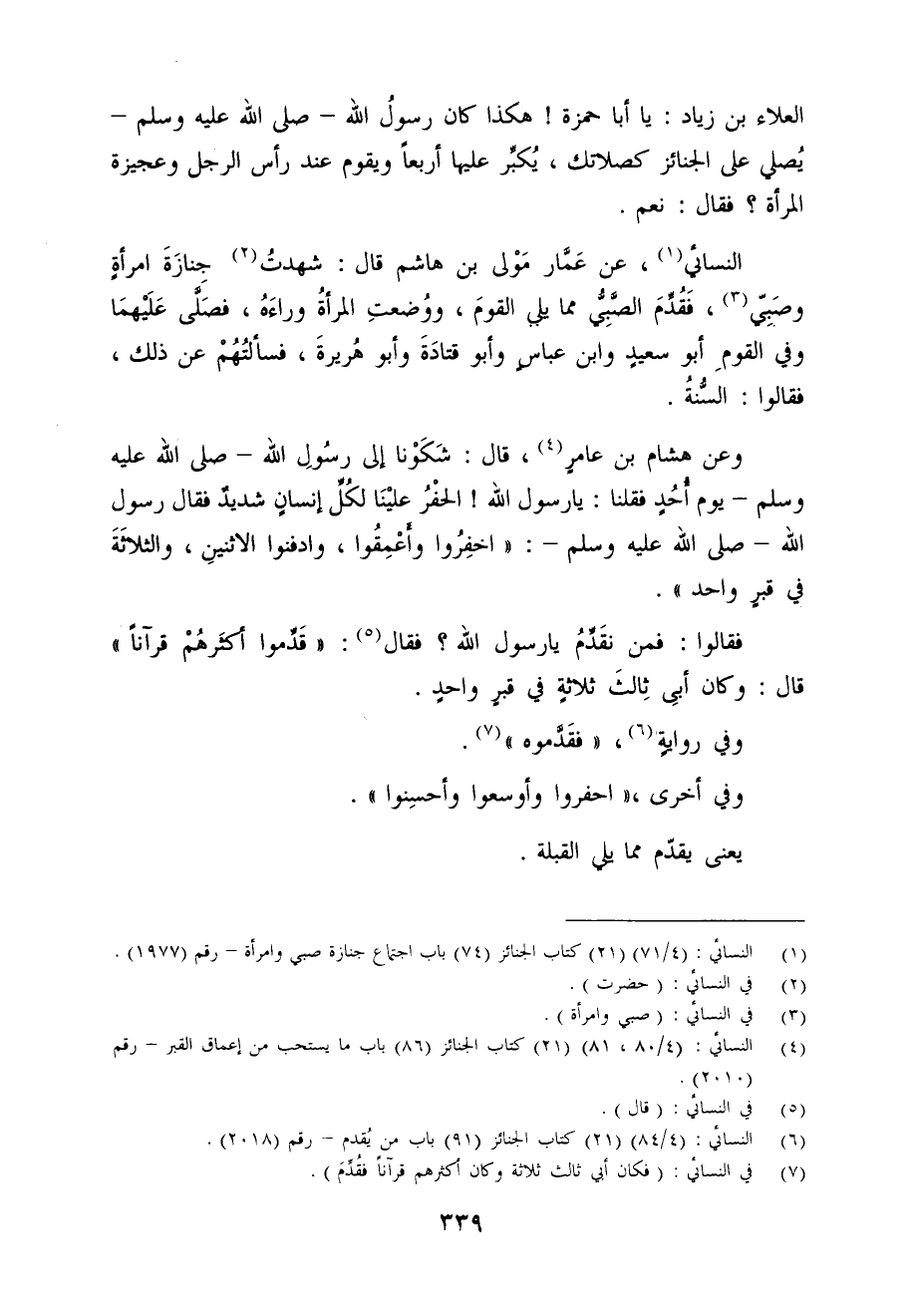 النسائي (¬1)، عن عَمَّار مَوْلى بن هاشم قال: شهدتُ (¬2) جِنازَةَ امرأةٍ وصَبِيّ (¬3)، فَقُدِّمَ الصَّبِيُّ مما يلِي القومَ، ووُضعتِ المرأةُ وراءَهُ، فصَلَّى عَلَيْهمَا وفي القومِ أبو سعيدٍ وابن عباسٍ وأبو قتادَةَ وأبو هُريرةَ، فسألتُهُمْ عن ذلك، فقالوا: السُّنةُ.