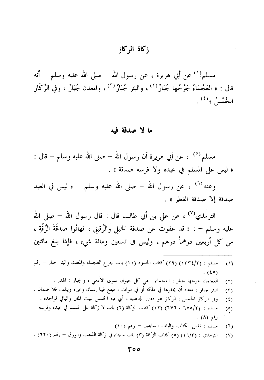 مسلم (¬5)، عن أبي هريرة أن رسول الله - صلى الله عليه وسلم - قال: "ليس على المسلم في عبده ولا فرسه صدقة".