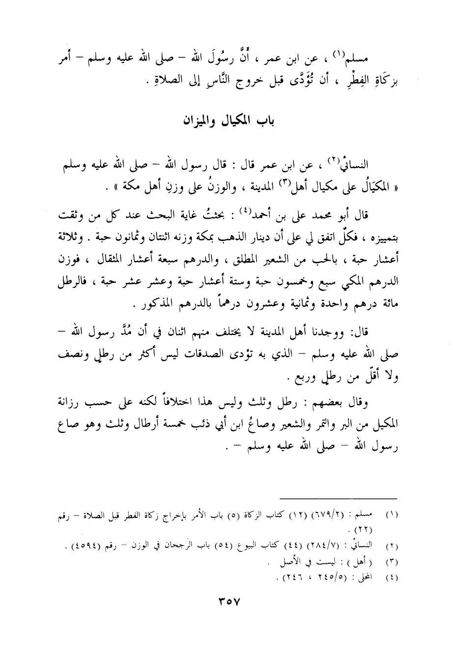 قال: ووجدنا أهل المدينة لا يختلف منهم اثنان في أن مُدَّ رسول الله - صلى الله عليه وسلم - الذي به تؤدى الصدقات ليس أكثر من رطل ونصف ولا أقلّ من رطلٍ وربع.