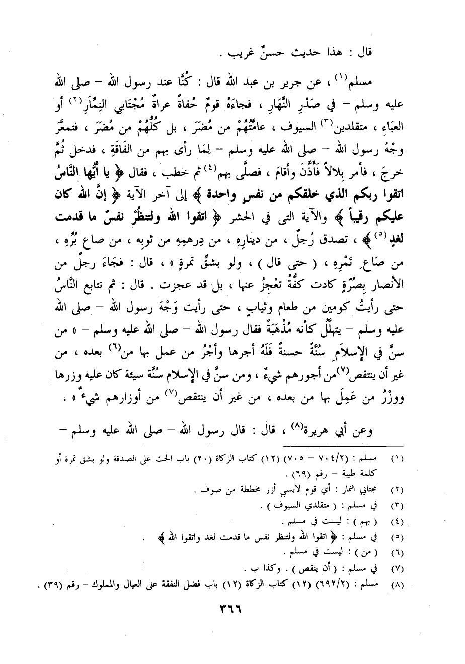 مسلم (¬1)، عن جرير بن عبد الله قال: كُنَّا عند رسول الله - صلى الله عليه وسلم - في صَدْرِ النَّهَارِ، فجاءَهُ قومٌ حُفاة عراة مُجْتَابي النِمِّارِ (¬2) أو العبَاءِ، متقلدين (¬3) السيوف، عامَّتُهُمْ من مُضَرَ، بل كُلُّهُمْ من مُضَرَ، فتمعَّرَ وجْهُ رسول الله - صلى الله عليه وسلم - لَمَا رأى بهم من الفَاقَةِ، فدخل ثمَّ خرجَ، فأمر بِلالاً فَأذَّنَ وأقامَ، فصلَّى بهم (¬4) ثم خطب، فقال {يَا أَيُّهَا النَّاسُ اتَّقُوا رَبَّكُمُ الَّذِي خَلَقَكُمْ مِنْ نَفْسٍ وَاحِدَةٍ} إلى آخر الآية {إِنَّ اللَّهَ كَانَ عَلَيْكُمْ رَقِيبًا} والآية التي في الحشر {اتَّقُوا اللَّهَ وَلْتَنْظُرْ نَفْسٌ مَا قَدَّمَتْ لِغَدٍ} (¬5) , تصدق رُجلٌ، من دينارِهِ، من دِرهمِهِ من ثوبِه، من صاع بُرِّهِ، من صَاعِ تَمْرِهِ، (حتى قال)، ولو بشق تمرةٍ"، قال: فجَاءَ رجلٌ من الأنصار بِصُرّةٍ كادت كفُّةُ تعْجِزُ عنها، بل قد عجزت. قال: ثم تتابع النَّاسُ حتى رأيتُ كومين من طعام وثياب، حتى رأيت وَجْهَ رسول الله - صلى الله عليه وسلم - يتهلَّلُ كأنه مُذْهَبَةٌ فقال رسول الله - صلى الله عليه وسلم - "من سنَّ في الاسلاَمِ سُنَّةً حسنةً فَلَهُ أجرها وأجْرُ من عمل بها من (¬6) بعده، من غير أن ينتقص (¬7) من أجورهم شيء، ومن سنَّ في الإِسلام سُنَة سيئة كان عليه وزرها ووزْرُ من عَمِلَ بها من بعده، من غير أن ينتقص (7) من أوزارهم شيءٌ".
