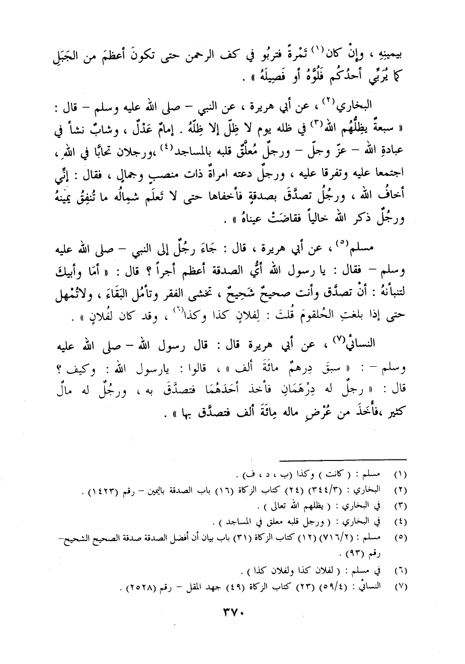 (¬2) البخاري: (3/ 344) (24) كتاب الزكاة (16) باب الصدقة باليمين - رقم (1423).