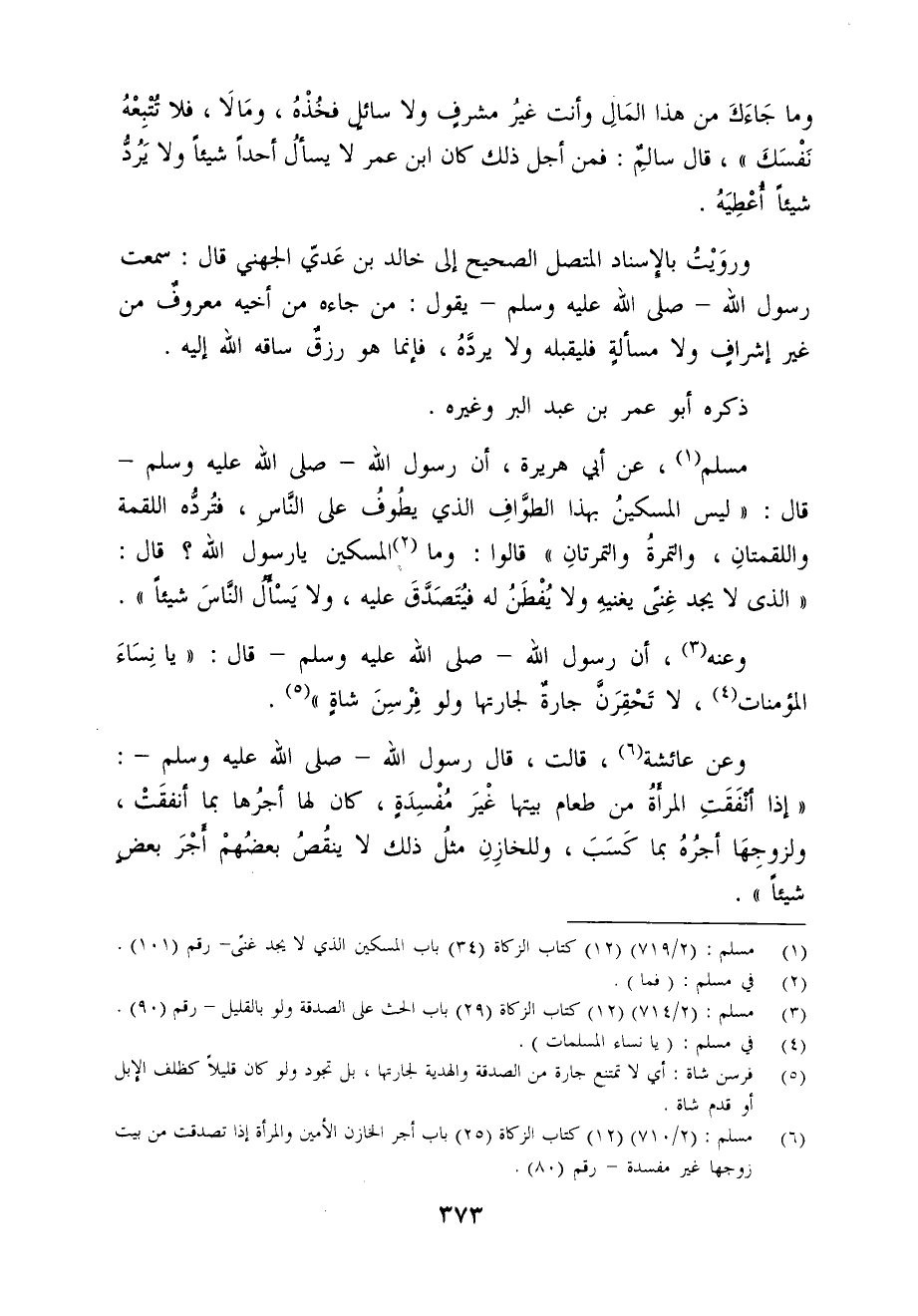 وروَيْتُ بالإِسناد المتصل الصحيح إلى خالد بن عَديّ الجهني قال: سمعت رسول الله - صلى الله عليه وسلم - يقول: من جاءه من أخيه معروفٌ من غير إشرافٍ ولا مسألةٍ فليقبله ولا يردَّهُ، فإنما هو رزقٌ ساقه الله إليه.