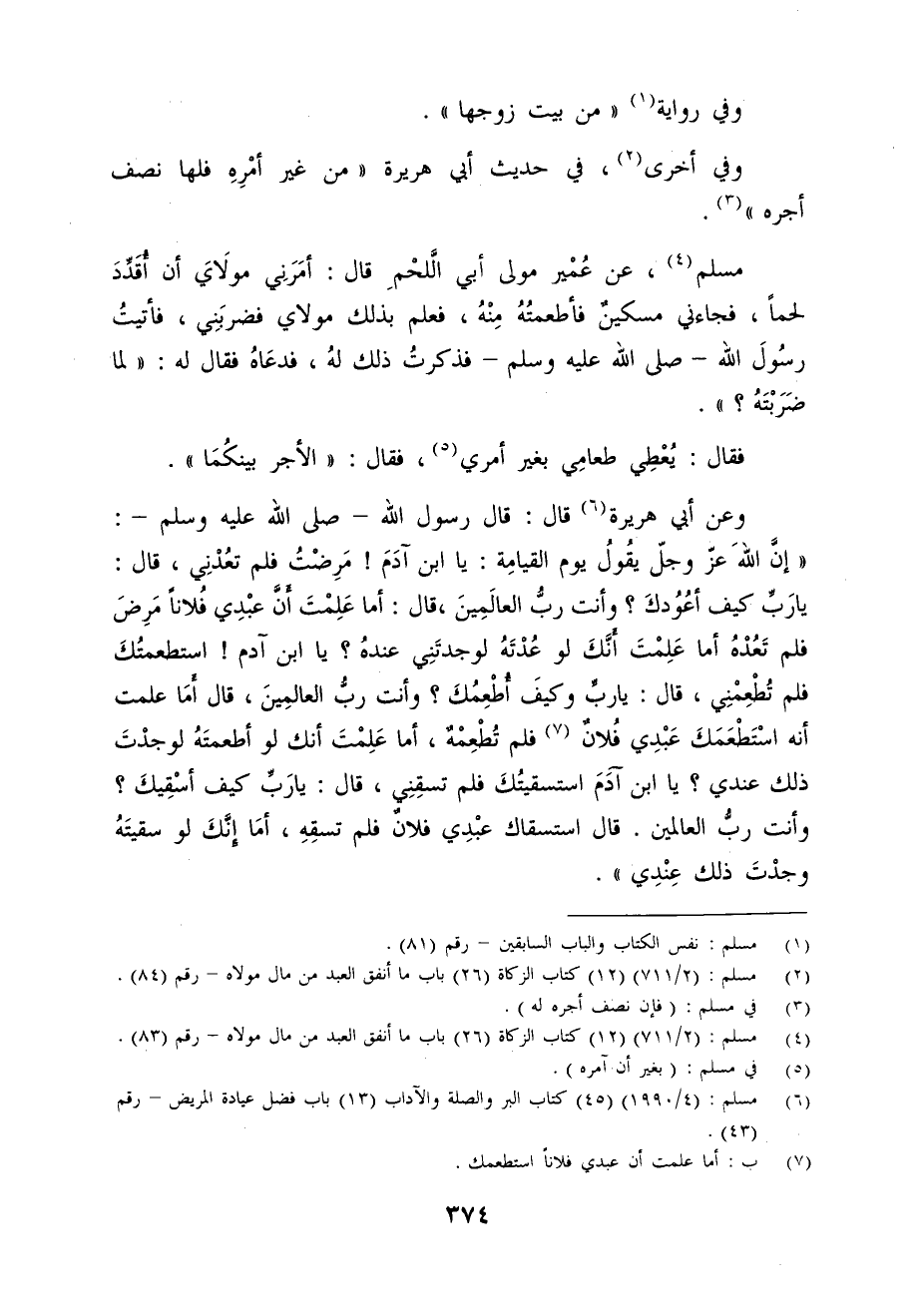 وعن أبي هريرة (¬6) قال: قال رسول الله - صلى الله عليه وسلم -: "إنَّ الله -عَزَّ وَجَلَّ- يقُولُ يوم القيامِة: يا ابن آدَمَ! مَرِضْتُ فلم تعُدْنِي، قال: يارَبِّ كيف أعُوُدكَ؟ وأنت ربُّ العالَمِينَ، قال: أما عَلِمْتَ أَنَّ عبْدِى فُلاناً مَرِضَ فلم تَعُدْهُ أما عَلِمْتَ أنَكَ لو عُدْتَهُ لوجدتَنِي عندهُ؟ يا ابن آدم! استطعمتُكَ فلم تُطْعِمْنِي، قال: يا ربِّ وكيفَ أُطْعِمُكَ؟ وأنت ربُّ العالمِينَ، قال أَمَا علمت أنه اسْتَطْعَمَكَ عَبْدِي فُلانٌ (¬7) فلم تُطْعِمْهٌ، أما عَلِمْتَ أنك لو أطعمتَهُ لوجدْتَ ذلك عندي؟ يا ابن آدَمَ استسقيتُكَ فلم تسقِنِي، قال: يا رَبِّ كيف أسْقِيكَ؟