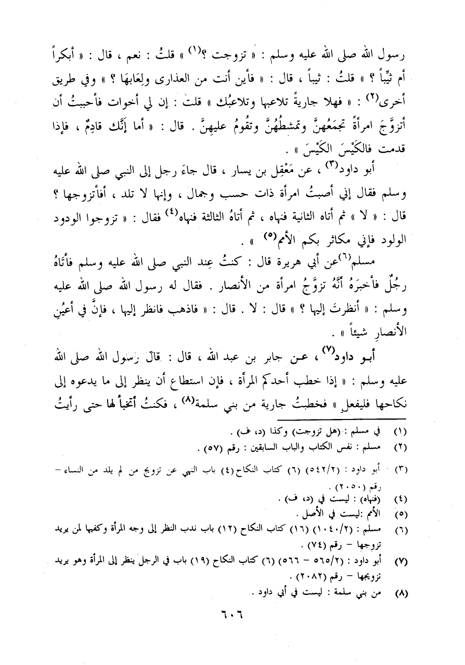 (¬7) أبو داود: (2/ 565 - 566) (6) كتاب النكاح (19) باب في الرجل ينظر إلى المرأة وهو يريد تزويجها - رقم (2082).