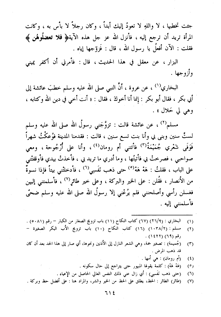 مسلم (¬2)، عن عائشة قالت: تزوَّجني رسولُ الله - صلى الله عليه وسلم - لستِّ سنين وبنى بي وأنا بنت تسع سنين، قالت: فقدمنا المدينة فوُعكْتُ شهرًا فَوَفَى شَعْري جُمَيْمَة (¬3) فأتتني أم رومان (¬4)، وأنا على أُرْجُوحة، ومعي صواحبي، فصرختْ بي فأتيتُها، وما أدري ما تريد بي، فأخذتْ بيدي فأوقفتْني على الباب، فقلتُ: هَهْ هَهْ (¬5) حتى ذهب نَفَسِي (¬6)، فأدخلتْني بيتًا فإذا نسوةٌ من الأنصار، فقُلن: على الخير والبركة، وعلى خير طائرٍ (¬7)، فأسلمتني إليهن فغسلن رأسي وأصلحنني فلم يرُعْني إلا رسولُ الله - صلى الله عليه وسلم - ضحىً فأسلمنني إليه.
