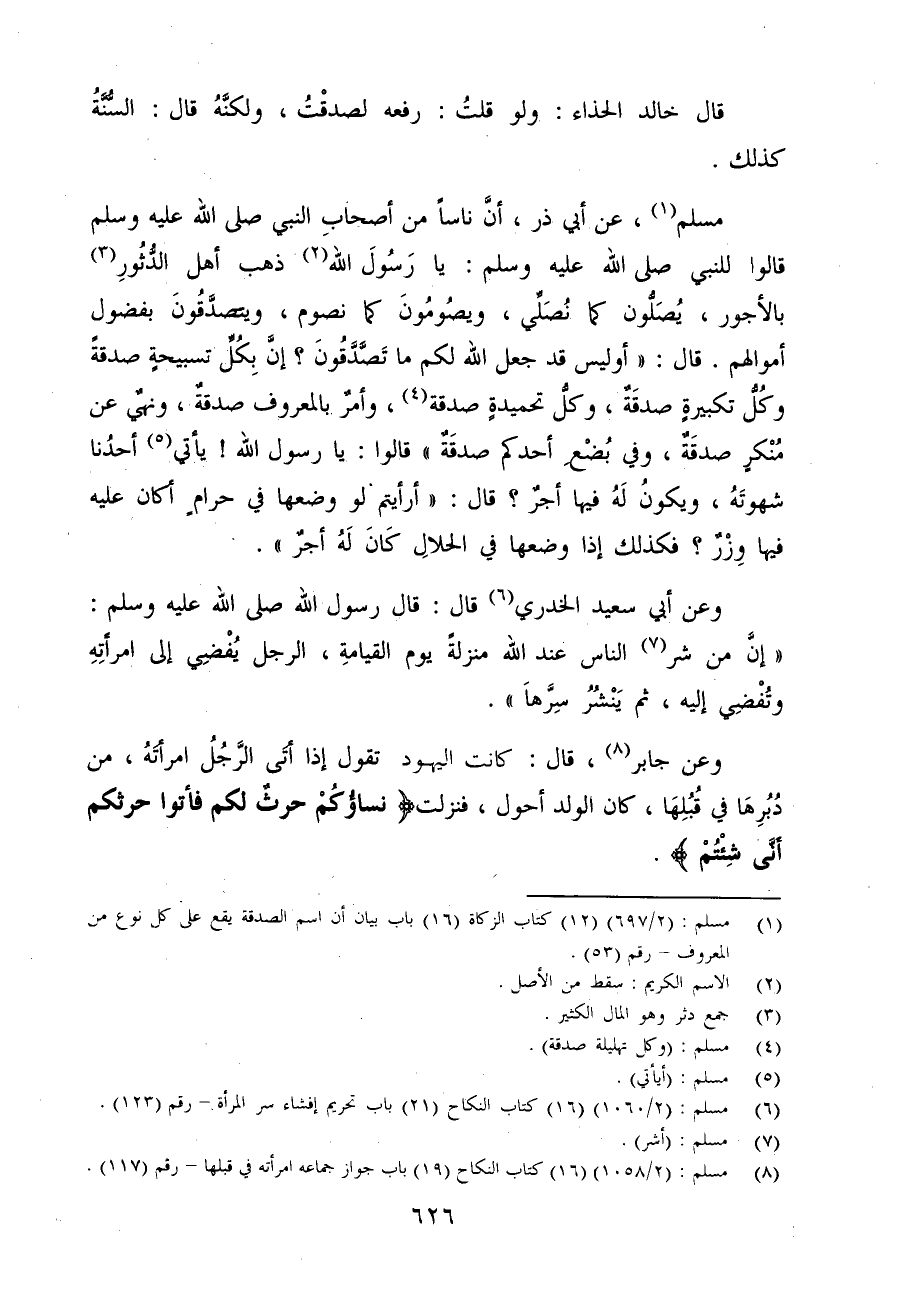 مسلم (¬1)، عن أبي ذر، أنَّ ناسًا من أصحابِ النبي - صلى الله عليه وسلم - قالوا للنبي - صلى الله عليه وسلم -: يا رَسُولَ الله (¬2) ذهب أهل الدُّثُورِ (¬3) بالأجور، يُصَلُّون كما نُصَلِّي، ويصُومُونَ نصوم، ويتصدَّقُونَ بفضول أموالهم. قال: "أو ليس قد جعل الله لكم ما تَصَّدَّقُونَ؟ إنَّ بِكُلِّ تسبيحةٍ صدقةً وكُلُّ تكبيرةٍ صدقَة، وكلُّ تحميدةٍ صدقة (¬4)، وأمرٌ. بالمعروف صدقةٌ، ونهيٌ عن مُنْكرٍ صدقَةٌ، وفي بُضْع أحدكم صدقَةٌ" قالوا: يا رسول الله! يأتي (¬5) أحدُنا شهوتَهُ، ويكونُ لَهُ فيها أجرٌ؟ قال: "أرأيتم لو وضعها في حرامٍ أكان عليه فيها وِزْرٌ؟ فكذلك إذا وضعها في الحلالِ كَانَ لَهُ أجرٌ".