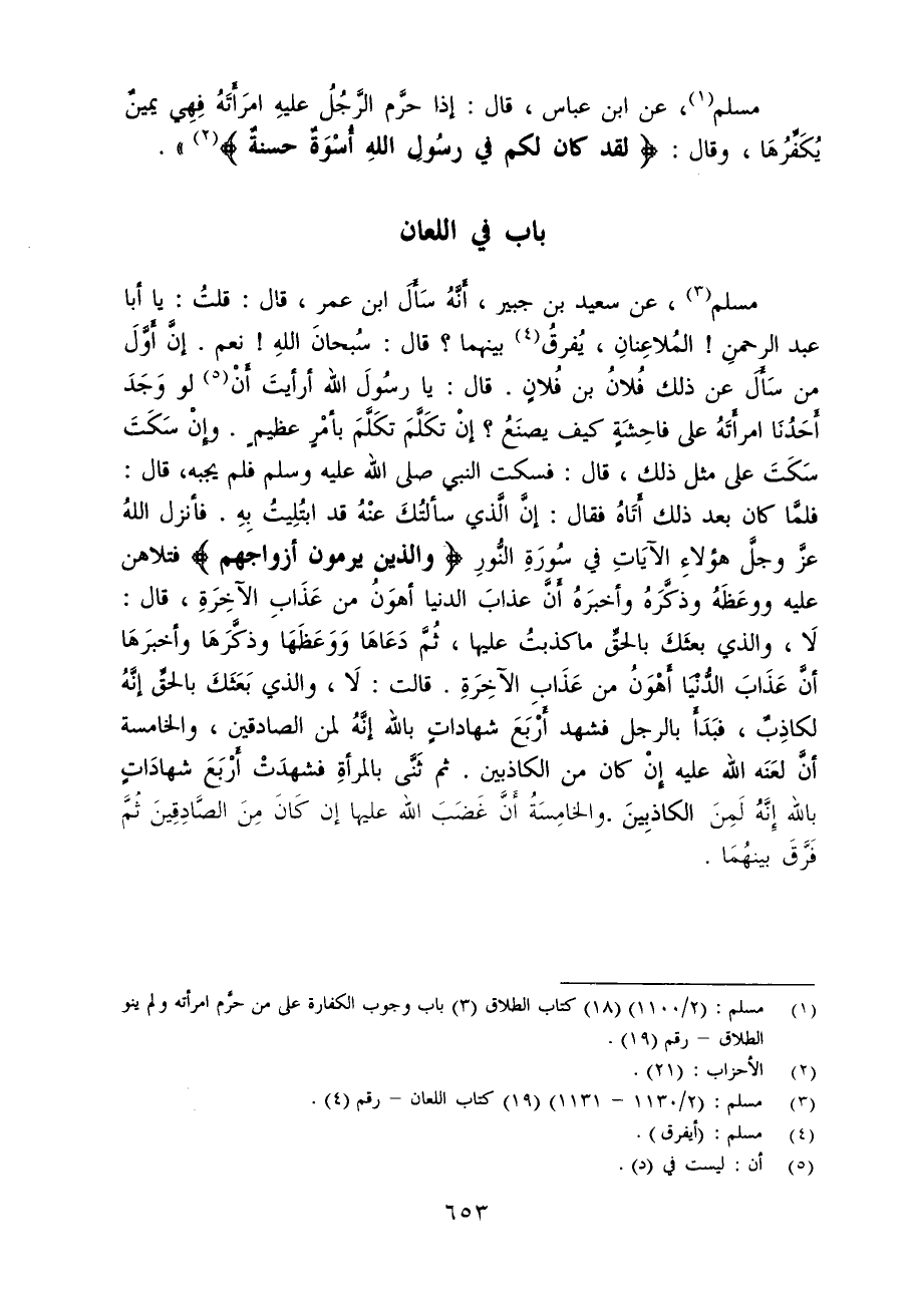 مسلم (¬3)، عن سعيد بن جبير، أَنَّهُ سَأَلَ ابن عمر، قال: قلتُ: يا أبا عبد الرحمنِ! المُلاعِنانِ، يُفرقُ (¬4) بينهما؟ قال: سُبحانَ اللهِ! نعم. إنَّ أَوَّلَ من سَأَلَ عن ذلك فُلانُ بن فُلانٍ. قال: يا رسُولَ الله أرأيتَ أَنْ (¬5) لو وَجَدَ أَحَدُنَا امرأَتَهُ على فاحِشَةٍ كيف يصنَعُ؟ إنْ تكَلَّمَ تكَلَّمَ بأمْرٍ عظيمٍ. وإنْ سَكَتَ سَكَتَ على مثل ذلك، قال: فسكت النبي - صلى الله عليه وسلم - فلم يجبه، قال: فلمَّا كان بعد ذلك أَتَاهُ فقال: إنَّ الَّذى سألتُكَ عنْهُ قد ابتُلِيتُ بِهِ. فأنزل اللهُ عزَّ وجلَّ هؤلاءِ الآيَاتِ في سُورَةِ النُّورِ {وَالَّذِينَ يَرْمُونَ أَزْوَاجَهُمْ} فتلاهن عليه ووعَظَهُ وذكَّرَهُ وأخبرَهُ أنَّ عذابَ الدنيا أهوَنُ من عَذَابِ الآخِرَةِ، قال: لَا، والذي بعثَكَ بالحقِّ ما كذبتُ عليها، ثُمَّ دَعَاهَا وَوَعَظهَا وذكَّرَهَا وأخبرَهَا أنَّ عَذَابَ الدُّنيا أهوَنُ من عَذَابِ الآخِرَةِ. قالت: لَا، والذي بَعَثَكَ بالحق إنَّهُ لكاذِبٌ، فبَدَأ بالرجل فشهد أَرْبَعَ شهاداتٍ بالله إنَّهُ لمن الصادقين، والخامسة أنَّ لعَنَه الله عليه إنْ كان من الكاذبين. ثم ثَنَّى بالمرأةِ فشهدَتْ أَرْبَعَ شهادَاتٍ بالله إِنَّهُ لَمِنَ الكاذبِينَ. والخامِسَةُ أَنَّ غَضَبَ الله عليها إن كَانَ مِنَ الصَّادِقِينَ ثُمَّ فَرَّقَ بينهُمَا.
