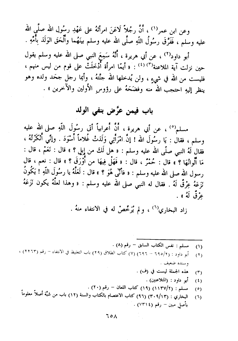 (¬2) أبو داود: (2/ 695 - 696) (7) كتاب الطلاق: (26) باب التغليظ في الانتفاء - رقم (2263)، وسنده ضعيف.