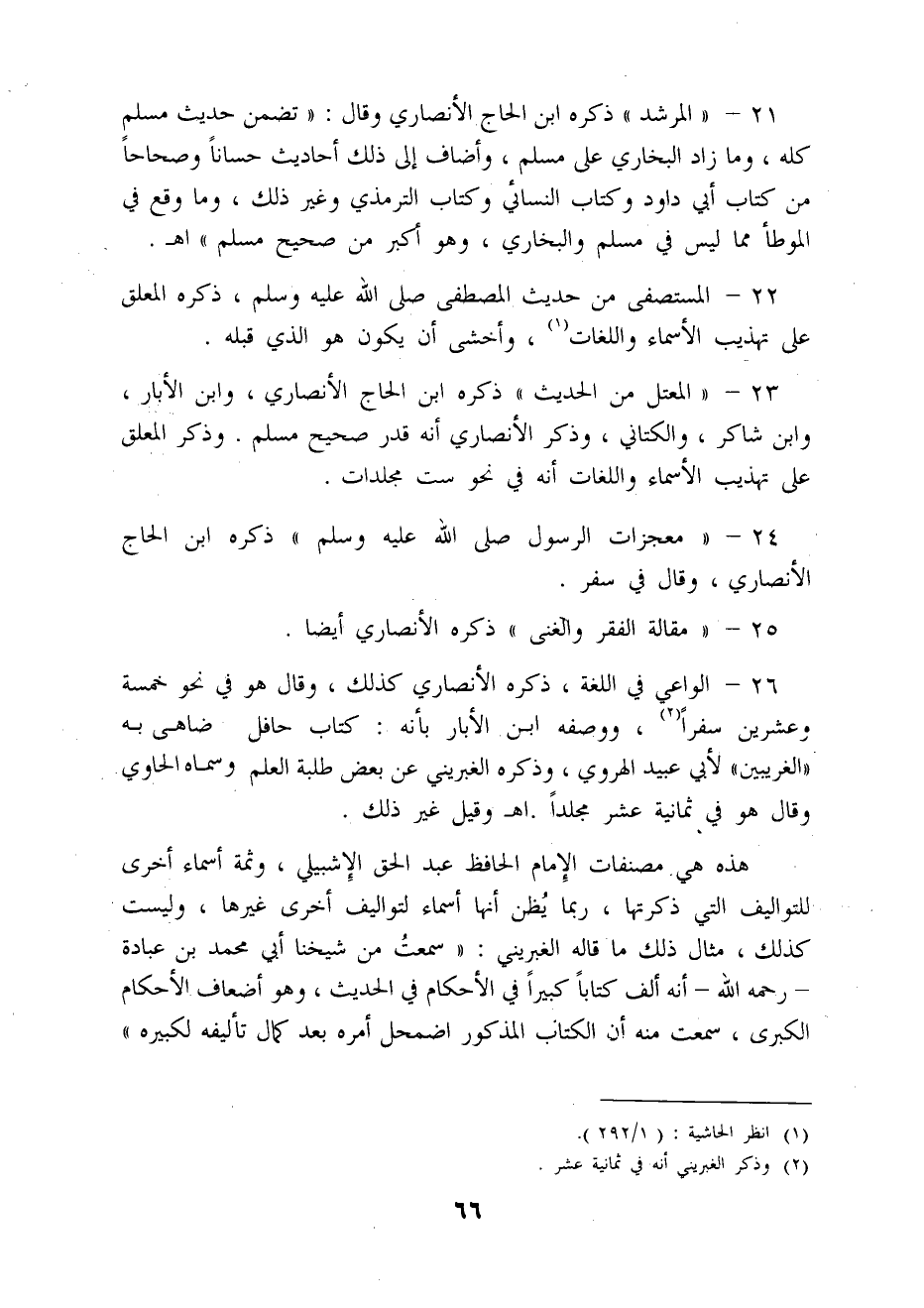 21 - "المرشد" ذكره ابن الحاج الأنصاري وقال: "تضمن حديث مسلم كله، وما زاد البخاري على مسلم، وأضاف إلى ذلك أحاديث حساناً وصحاحاً من كتاب أيى داود وكتاب النسائي وكتاب الترمذي وغير ذلك، ومما وقع في الموطأ مما ليس في مسلم والبخاري، وهو أكبر من صحيح مسلم" اهـ.