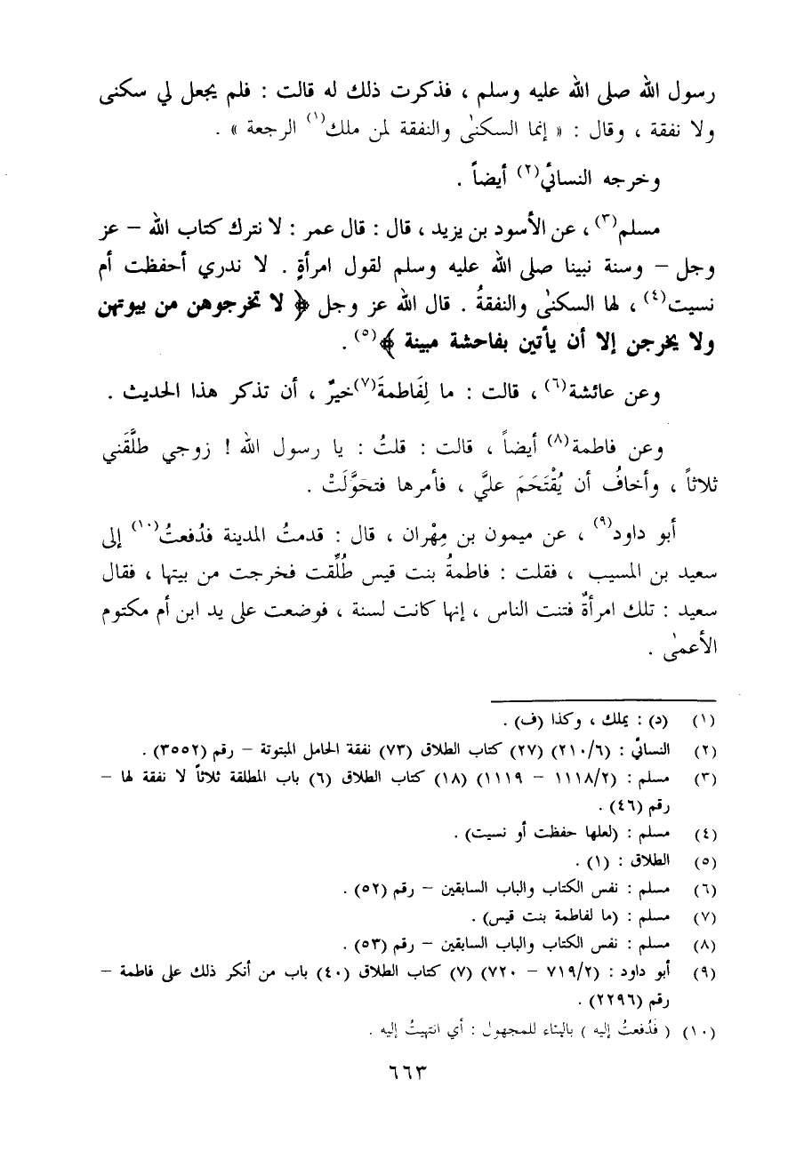 مسلم (¬3)، عن الأسود بن يزيد، قال: قال عمر: لا نترك كتاب الله -عز وجل- وسنة نبينا - صلى الله عليه وسلم - لقول امرأةٍ. لا ندري أحفظت أم نسيت (¬4)، لها السكنى والنفقةُ. قال الله -عَزَّ وَجَلَّ- {لَا تُخْرِجُوهُنَّ مِنْ بُيُوتِهِنَّ وَلَا يَخْرُجْنَ إِلَّا أَنْ يَأْتِينَ بِفَاحِشَةٍ مُبَيِّنَةٍ} (¬5).