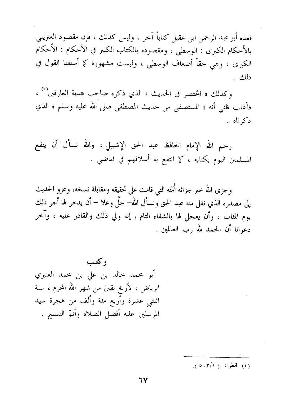 رحم الله الإِمام الحافظ عبد الحق الإشبيلي، والله نسأل أن ينفع المسلمين اليوم بكتابه، كما انتفع به أسلافهم في الماضي.