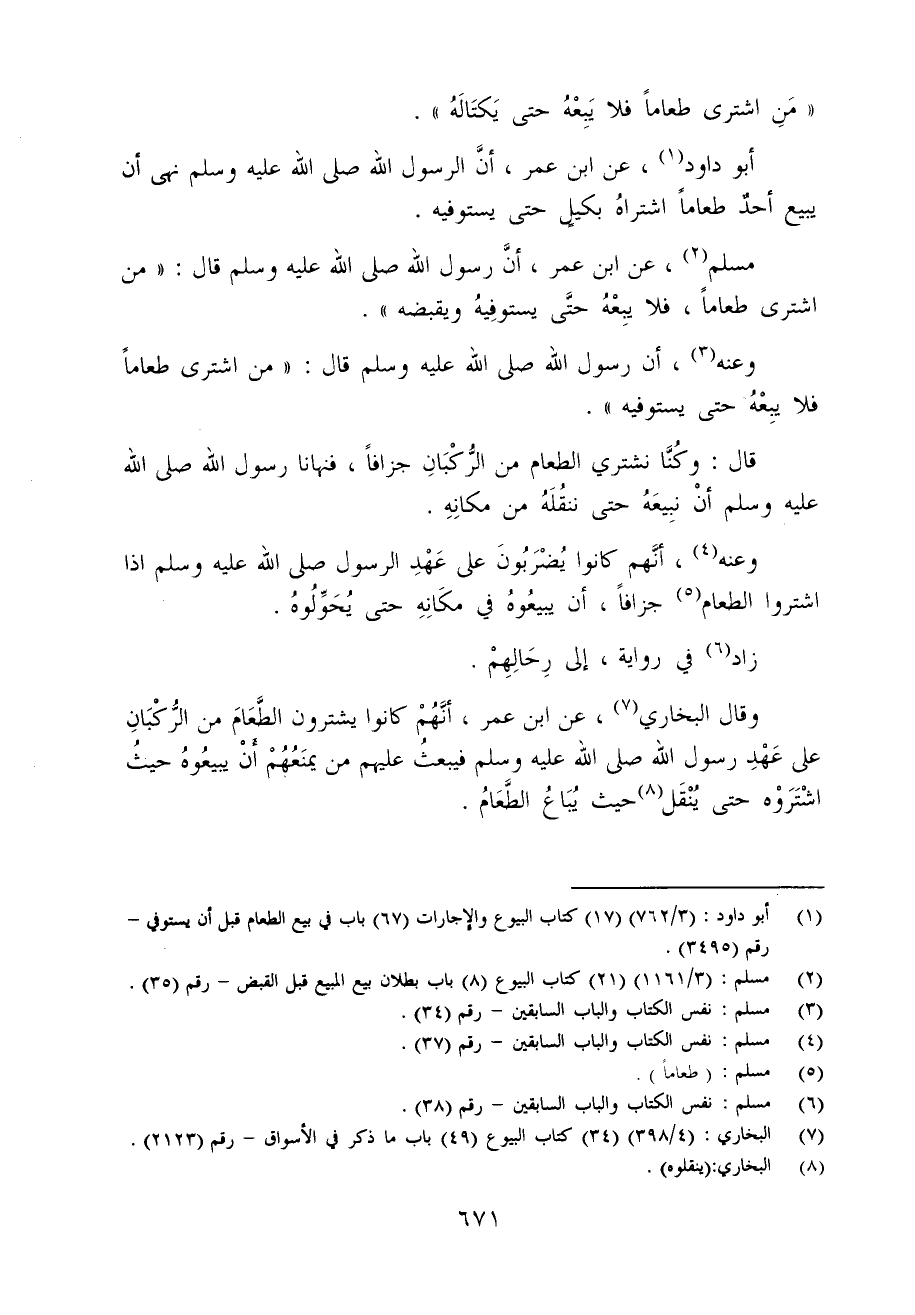 مسلم (¬2)، عن ابن عمر، أنَّ رسول الله - صلى الله عليه وسلم - قال: "من اشترى طعامًا، فلا يبِعْهُ حتى يستوفِيهُ ويقبضه".