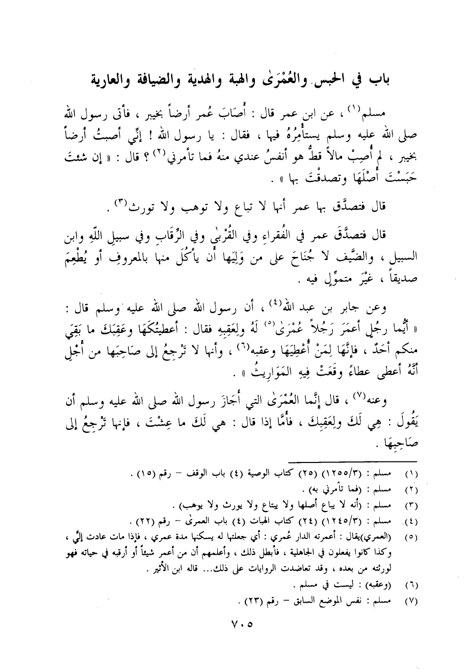 (¬5) (العمرى) يقال: أعمرته الدار عُمرى: أي جعلتها له يسكنها مدة عمرى، فإذا مات عادت إليَّ، وكذا كانوا يفعلون في الجاهلية، فأبطل ذلك، وأعلمهم أن من أعمر شيئًا أو أرتبه في حياته فهر لورثته من بعده، وقد تعاضدت الروايات على ذلك ... قاله ابن الأثير.