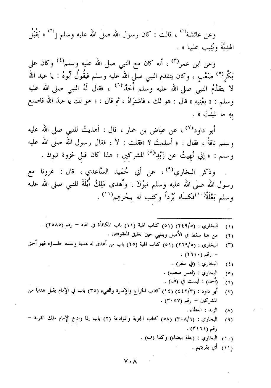 (¬7) أبو داود: (3/ 442) (14) كتاب الخراج والإمارة والفيء (35) باب في الإِمام يقبل هدايا من المشركين - رقم (3057).