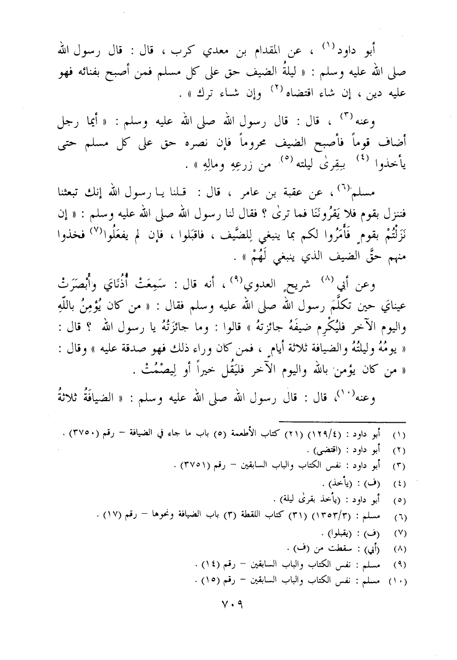 أبو داود (¬1)، عن المقدام بن معدي كرب، قال: قال رسول الله - صلى الله عليه وسلم -: "ليلةُ الضيف حق على كل مسلم فمن أصبح بفنائه فهو عليه دين، إن شاء اقتضاه (¬2) وإن شاء ترك".