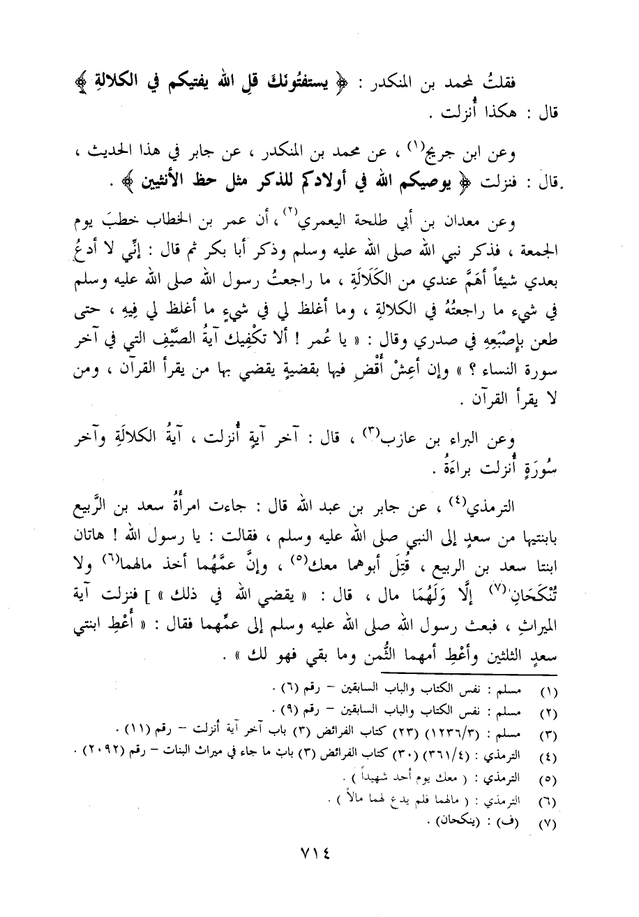 فقلتُ لمحمد بن المنكدر: {يَسْتَفْتُونَكَ قُلِ اللَّهُ يُفْتِيكُمْ فِي الْكَلَالَةِ} قال: هكذا أُنزلت.