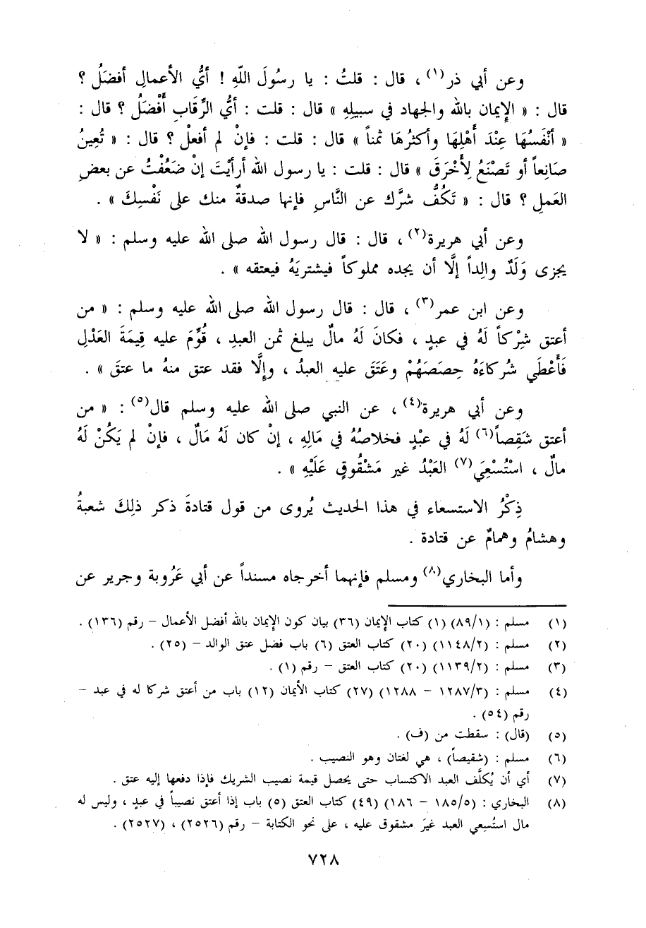 (¬8) البخاري: (5/ 185 - 186) (49) كتاب العتق (5) باب إذا أعتق نصيبًا في عبدٍ، وليس له مال استسِعى العبد غيرَ مشقوق عليه، على نحو الكتابة - رقم (2526)، (2527).